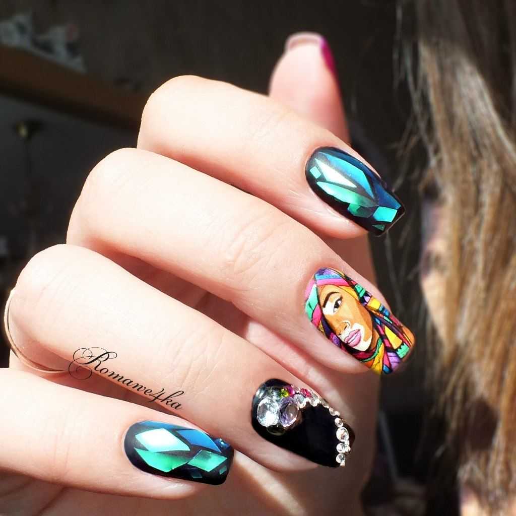 Интересно выглядят нейл-арты с портретами и лицами. Пример такого маникюра вы можете видеть ниже