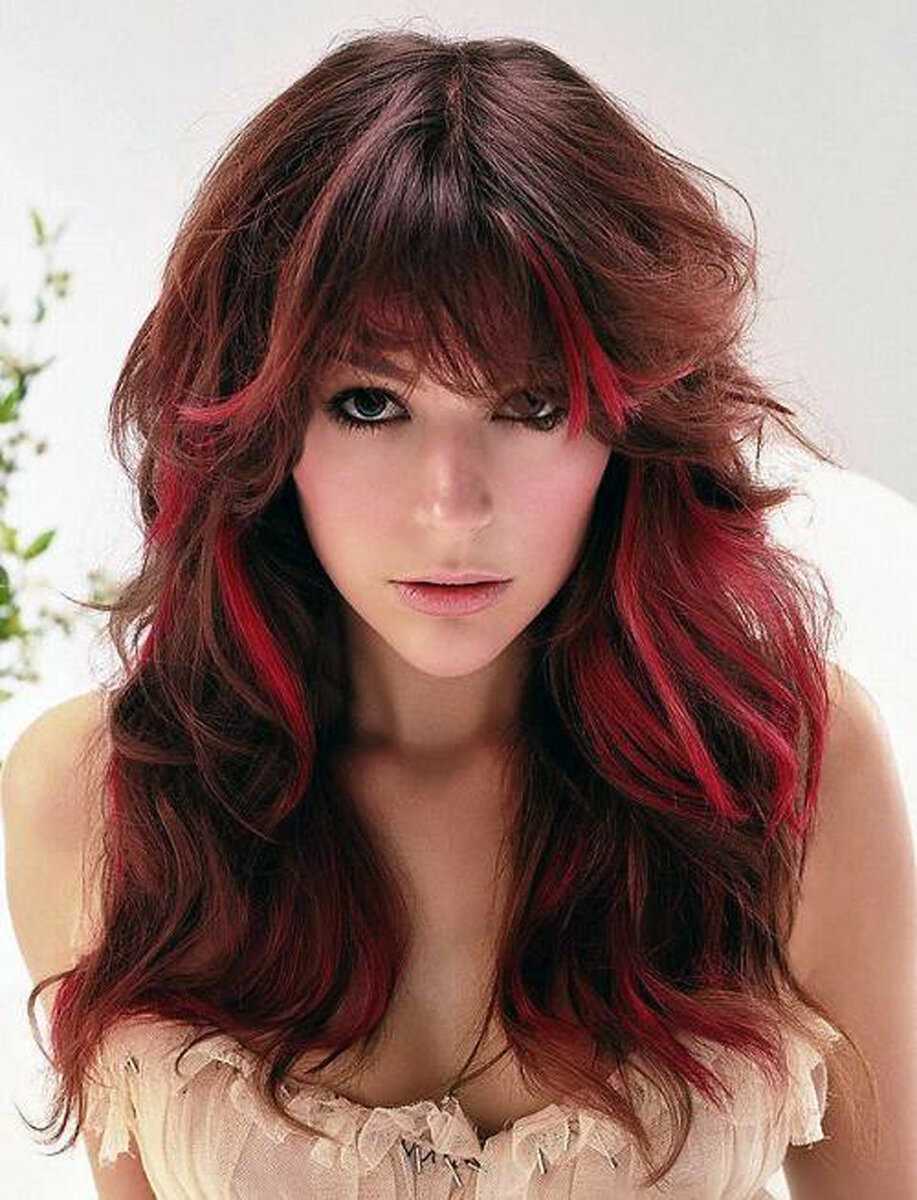 Лаконичный и акцентный роунз изящно смотрится на темных волосах: красящими составами медных и красных оттенков прорабатываются отдельные пряди или челка.