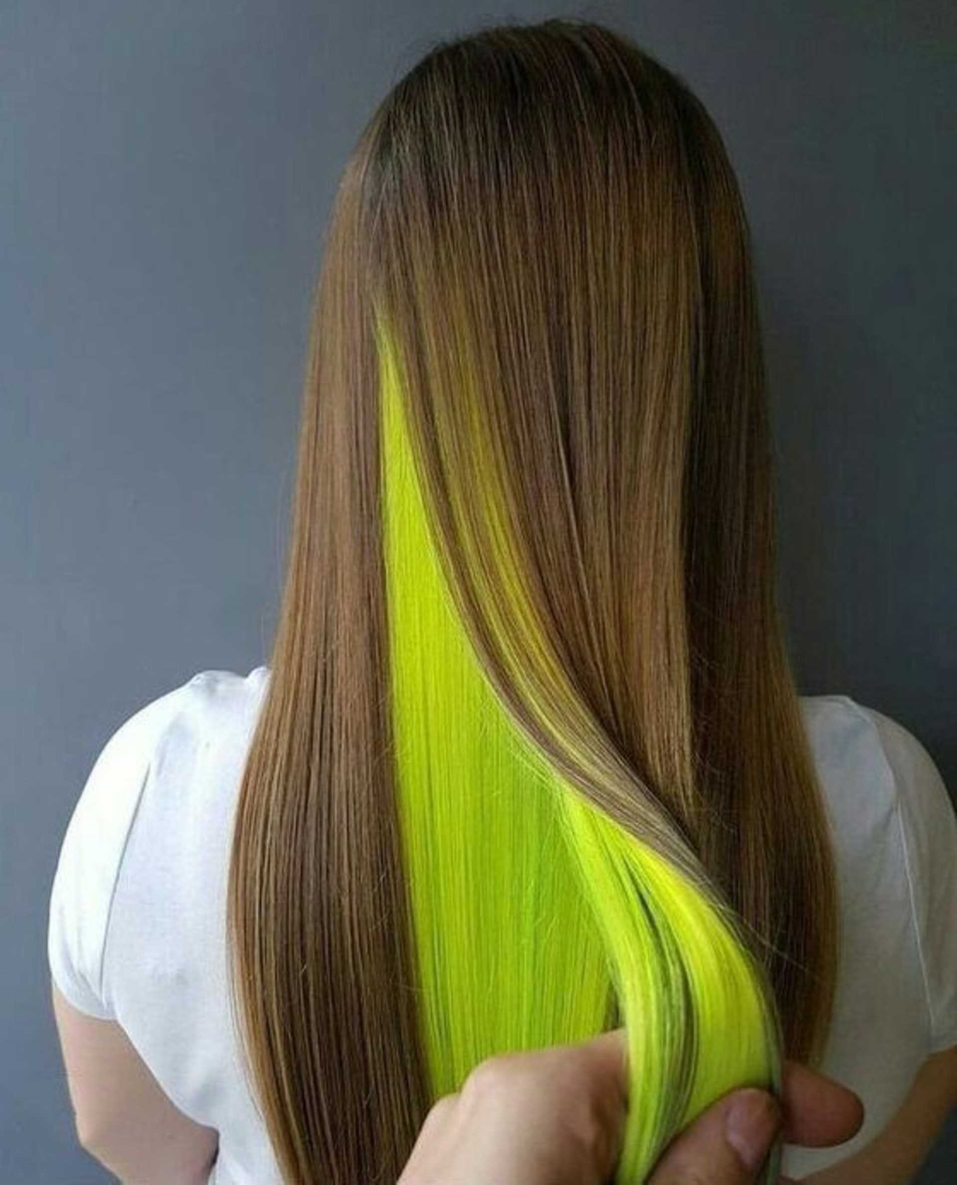 Скрытое окрашивание выполняется яркими красящими составами на определенном небольшом участке волос. Например, делаем на затылке яркие пряди, которые сверху можно закрыть волосами натурального оттенка, растущими в лобной и височной зоне.