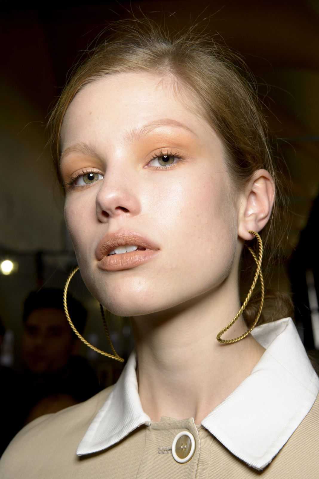 Уже не первый год нюдовый макияж становится основной модной тенденцией сезона. Осень зима 2019 года стал исключением. Вы всегда останетесь в тренде, если предпочтете «макияж без макияжа» и добавите на губы немного блеска или помады с глянцевым финишем. Завершается образ обильным нанесением румян на скулы и небольшим количеством хайлайтера на лоб, нос и подбородок.