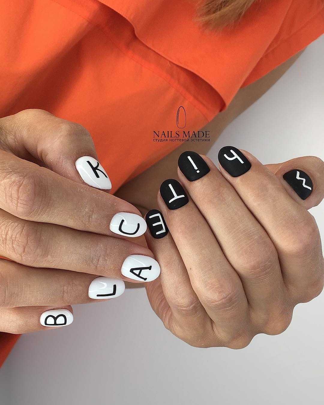Не смотря на лаконичность белого цвета, такое оформление притягивает взгляды и на руках школьницы смотрится довольно броско, поэтому лето – самое время обратить на себя внимание таким способом. Однако учитывая полёт фантазии юных модниц, и для того чтобы белые ноготки не смотрелись слишком просто, стилисты предлагают дополнить фон стильными надписями с логотипами известных фирм или названиями социальных сетей