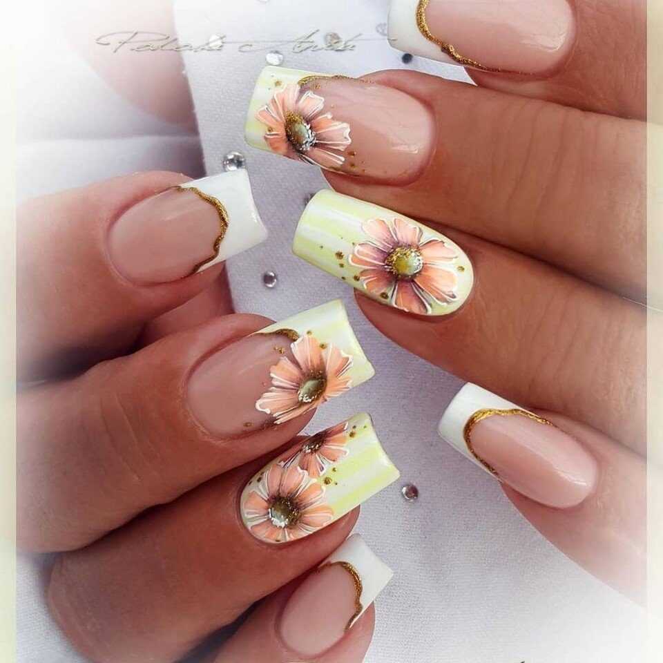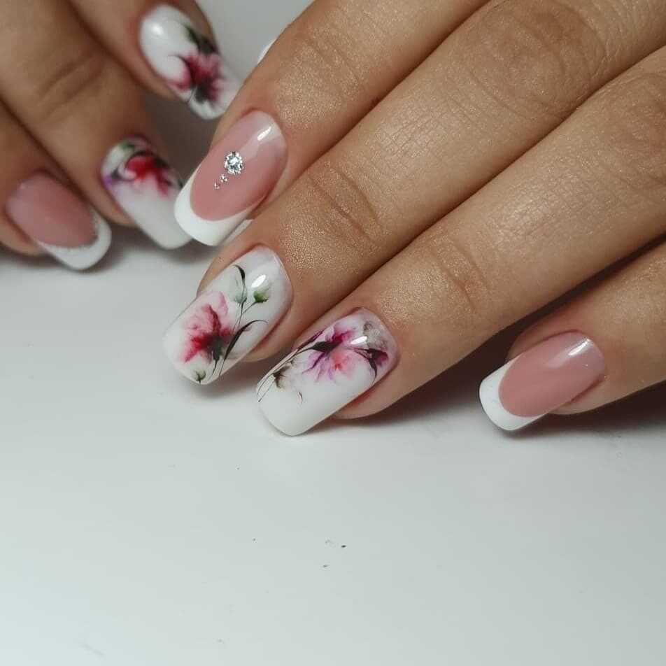 Френч, в котором на кончик ногтевой пластины наносится миниатюрная цветочная композиция, имитирующая улыбку или дизайн с объёмными цветами. А также маникюр с яркими цветными изображениями, френч с нестандартной двойной, треугольной или скошенной улыбкой, которая дополняется цветочными рисунками и прочие примеры. При этом можно дополнительно освежать узоры различными видами блёсток или камнями.