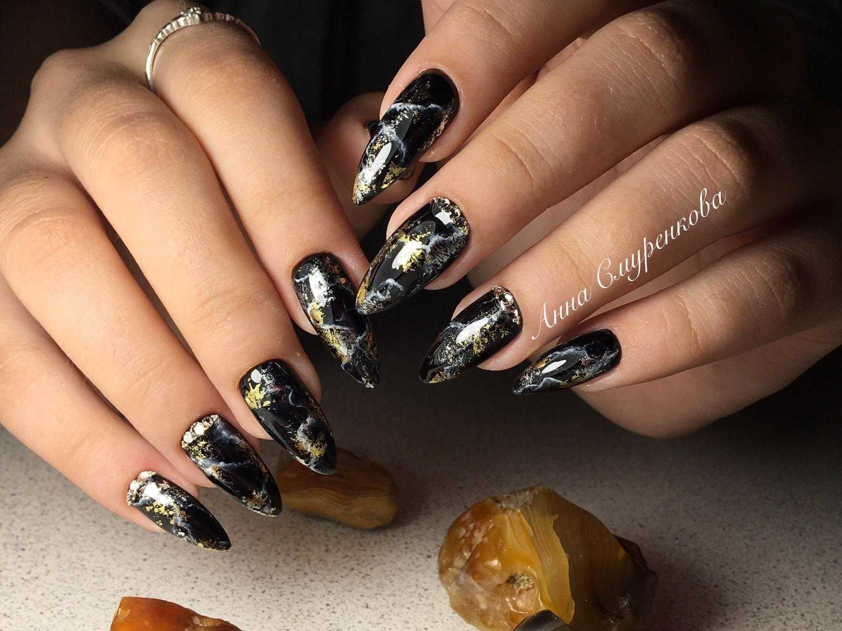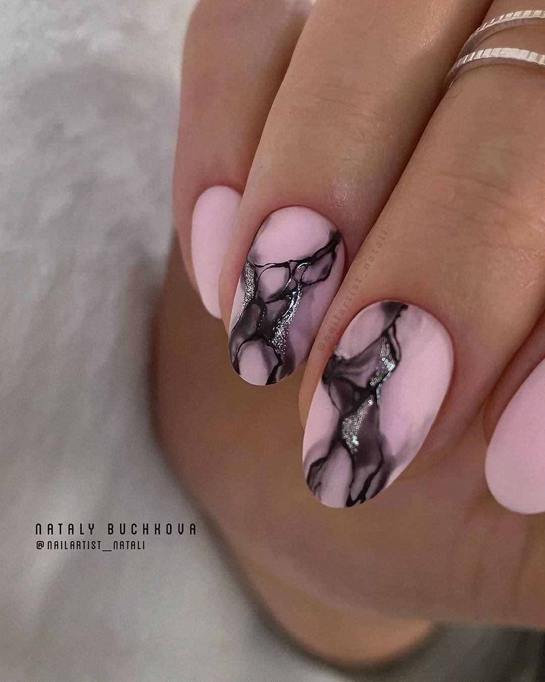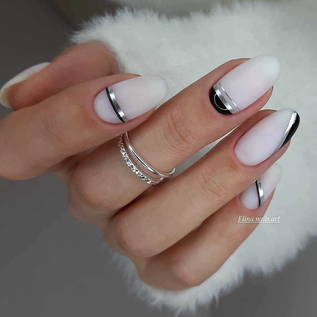 Тренд последних сезонов – декор с помощью черного геля-тянучки. Для создания стильного дизайна достаточно нанести небольшое количество геля поверх молочного фона, добавить черные стразы, глиттер и другой блестящий декор. На молочном фоне отлично смотрится маникюр с дизайном минимализм. Например, можно дополнить молочный маникюр точками, абстрактными узорами, волнами, штрихами.