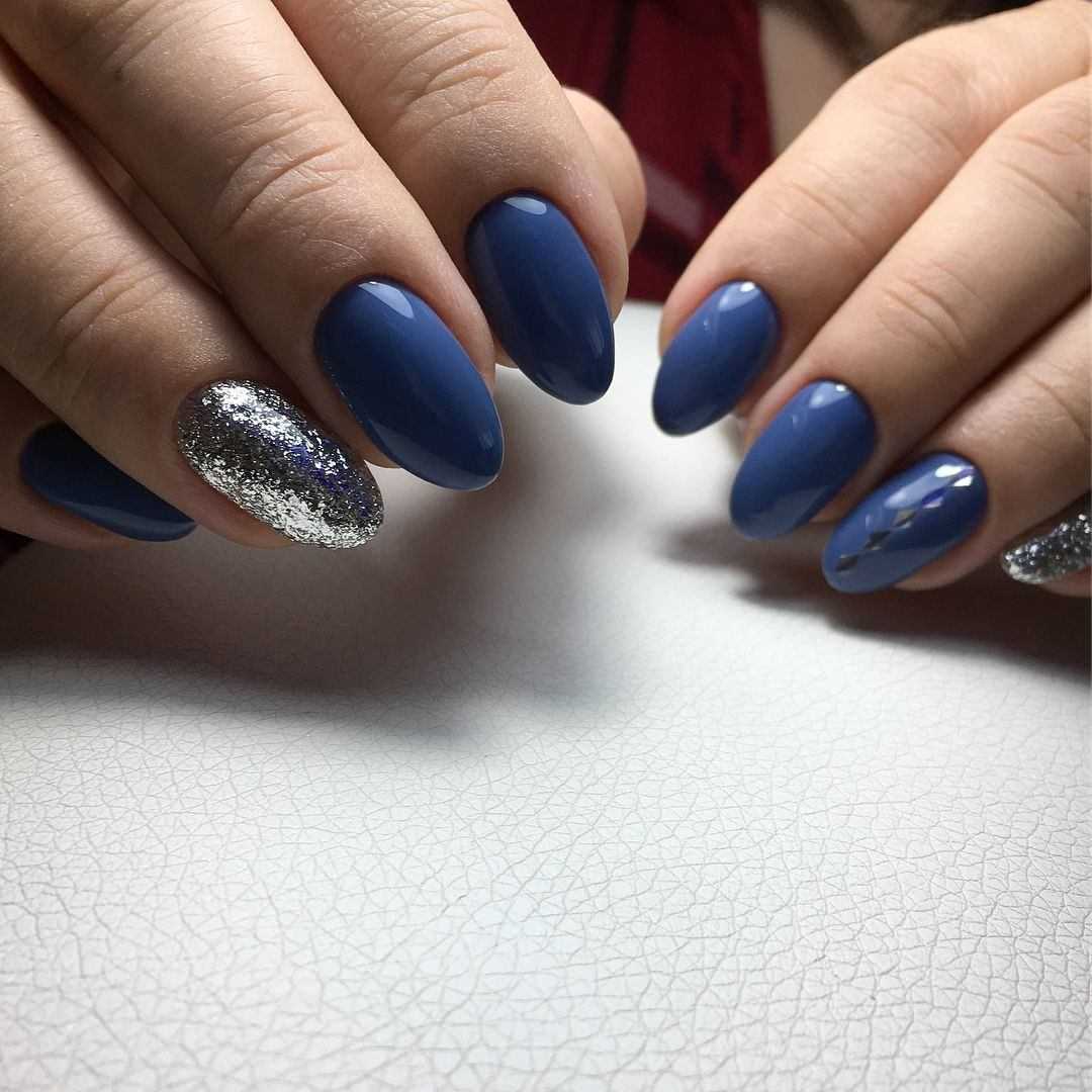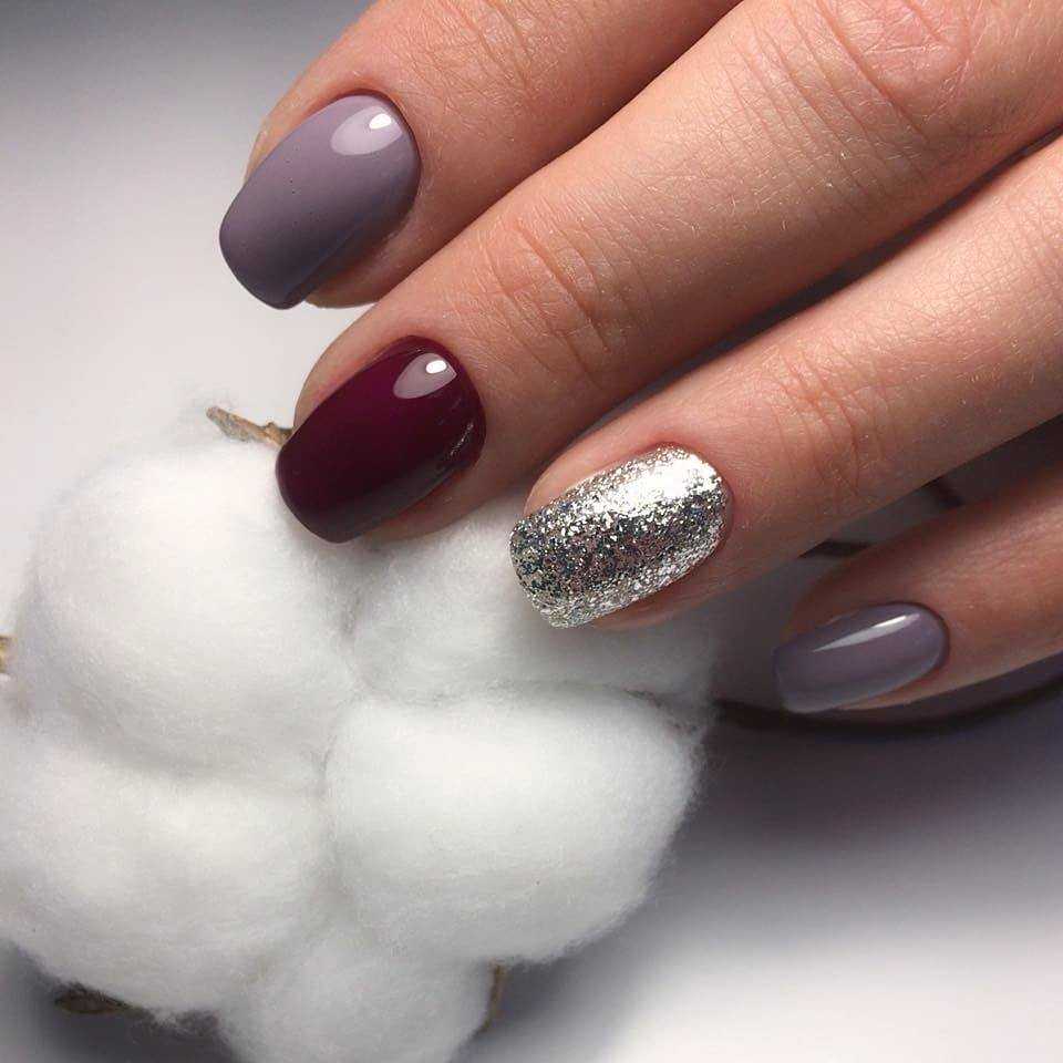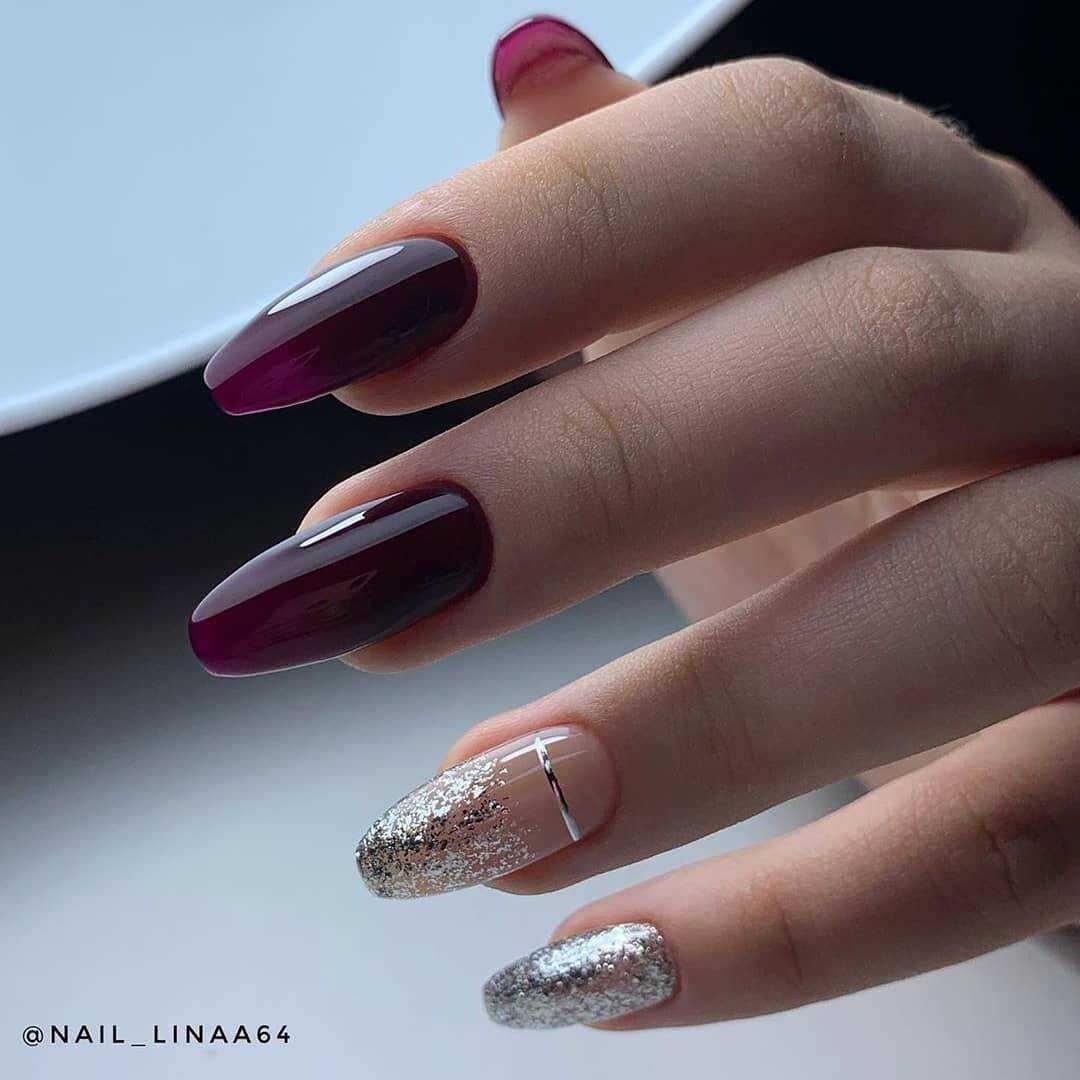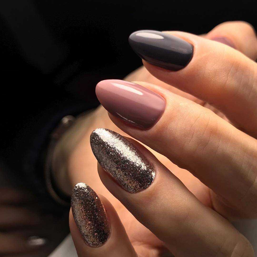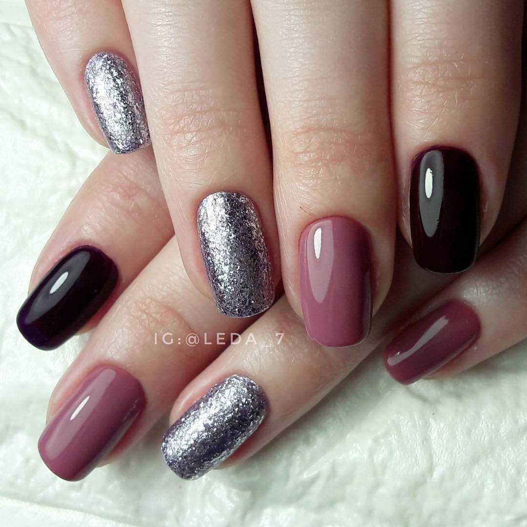 Блестящий декор желательно располагать на 1-2 пальцах руки. Эффектно смотрится дизайн с крупными блестками, с пайетками. Что касается основного оттенка маникюра, то можно использовать как пастельные тона: розовый, бежевый, серый и другие, так и черный, бордовый, насыщенный красный, синий цвета.