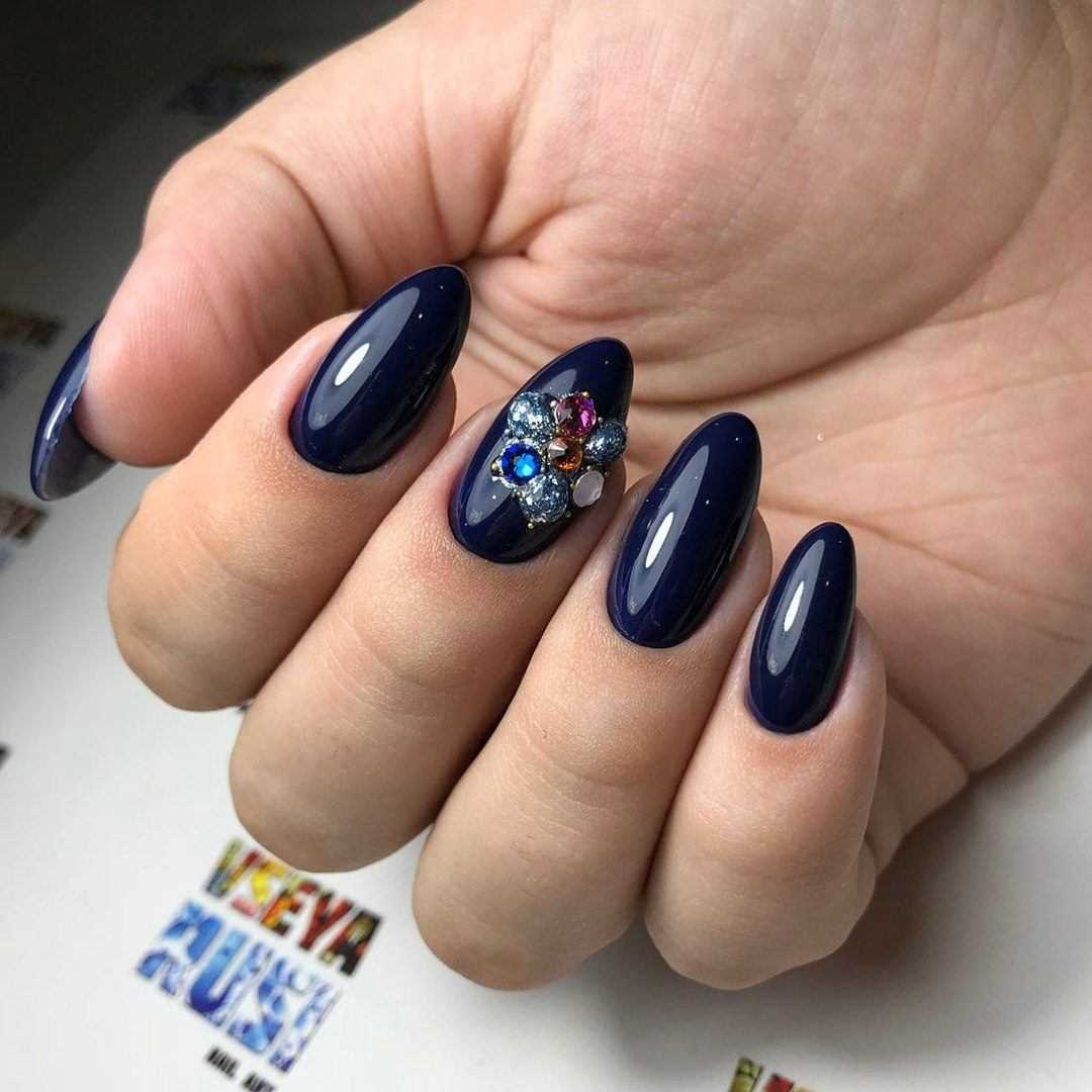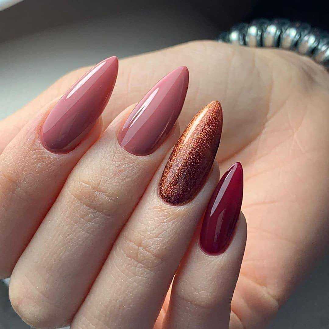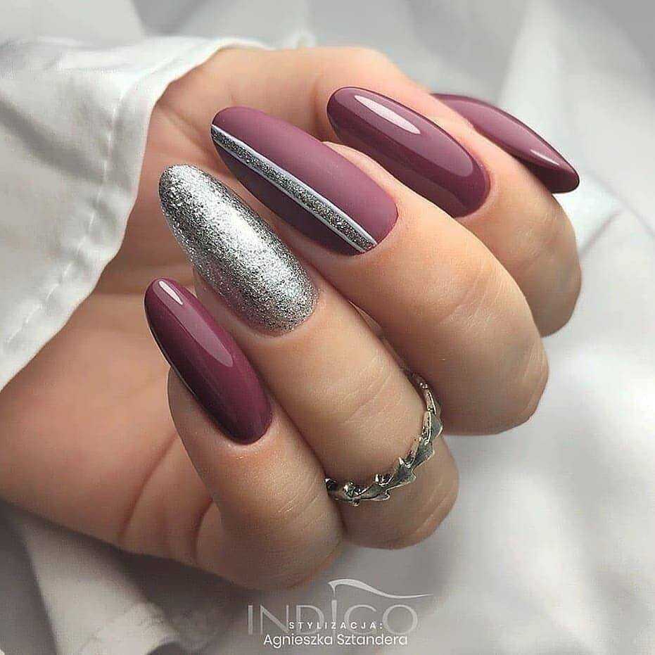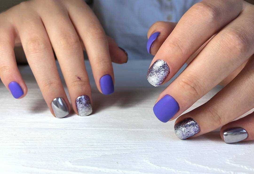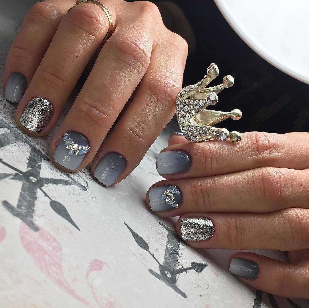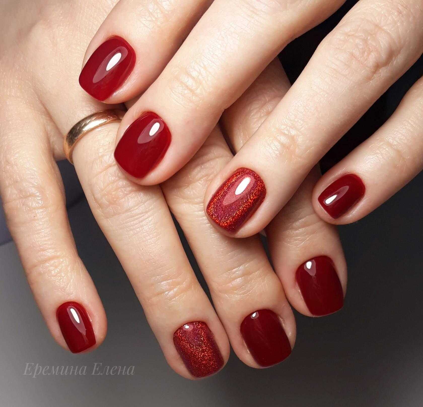 Блестящий декор желательно располагать на 1-2 пальцах руки. Эффектно смотрится дизайн с крупными блестками, с пайетками. Что касается основного оттенка маникюра, то можно использовать как пастельные тона: розовый, бежевый, серый и другие, так и черный, бордовый, насыщенный красный, синий цвета.