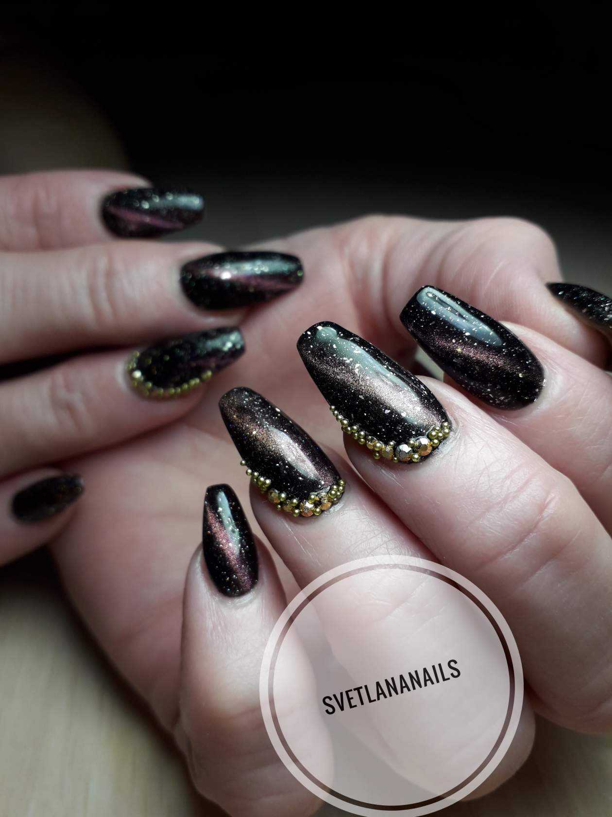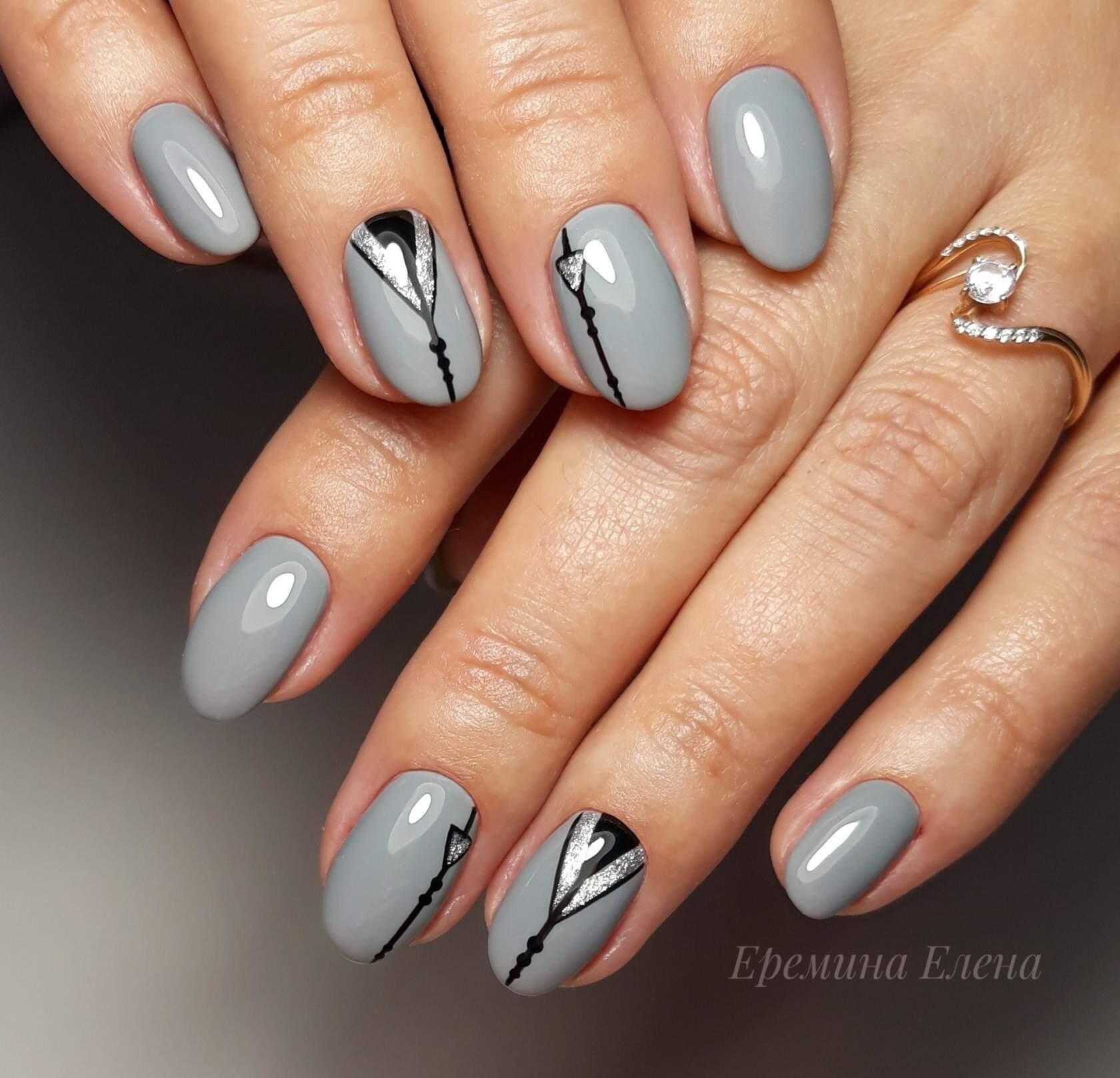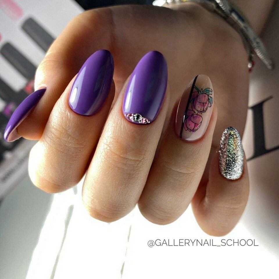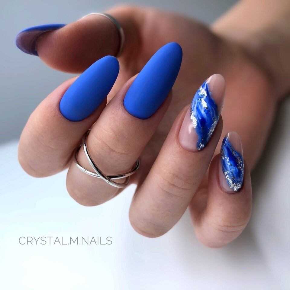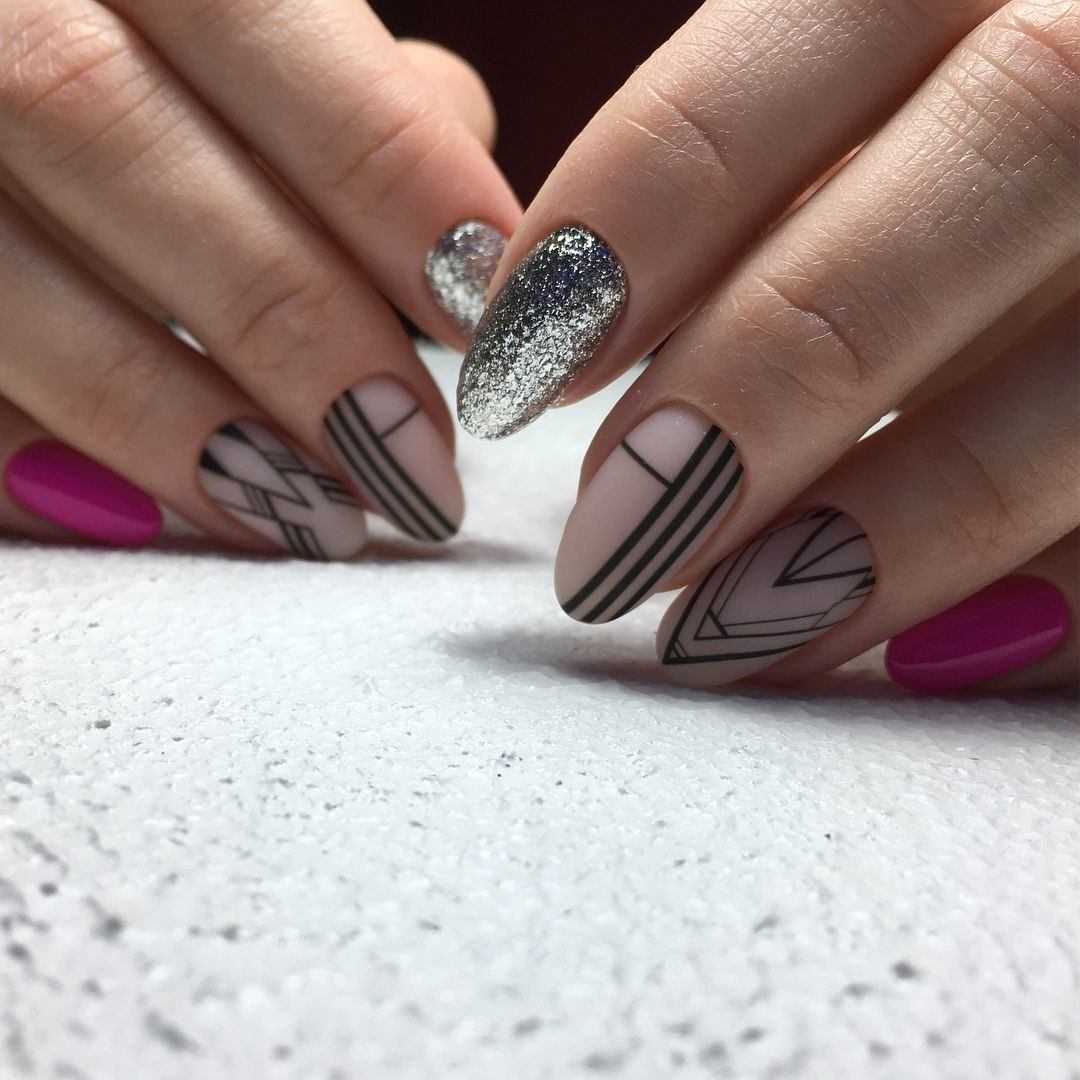 Блестящий декор желательно располагать на 1-2 пальцах руки. Эффектно смотрится дизайн с крупными блестками, с пайетками. Что касается основного оттенка маникюра, то можно использовать как пастельные тона: розовый, бежевый, серый и другие, так и черный, бордовый, насыщенный красный, синий цвета.