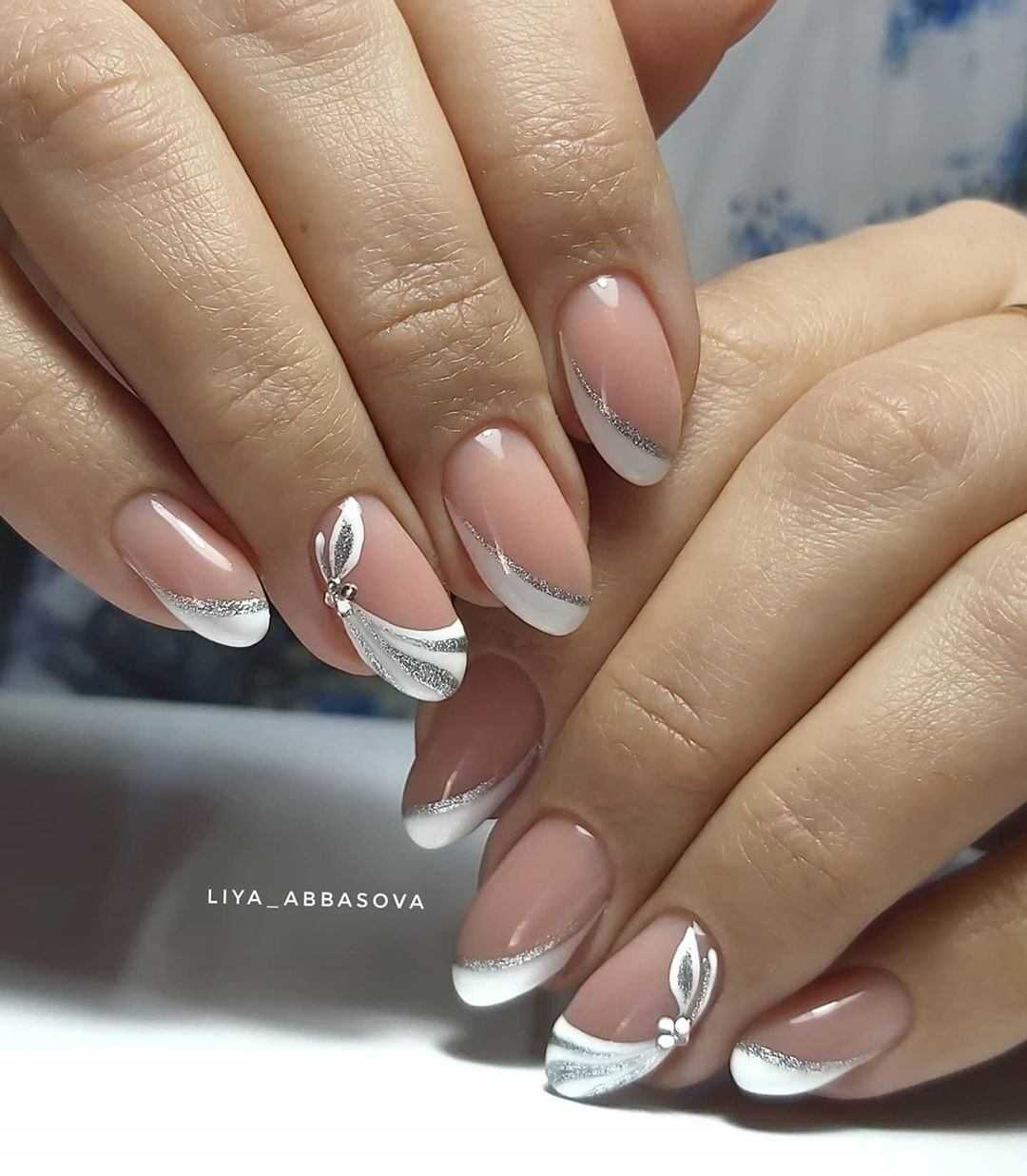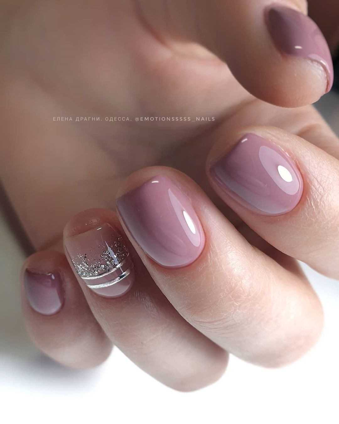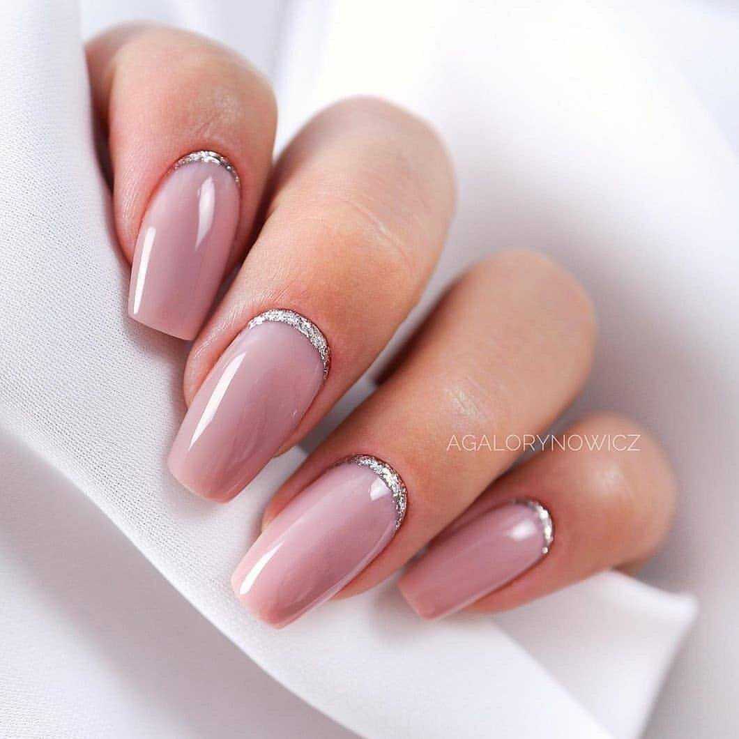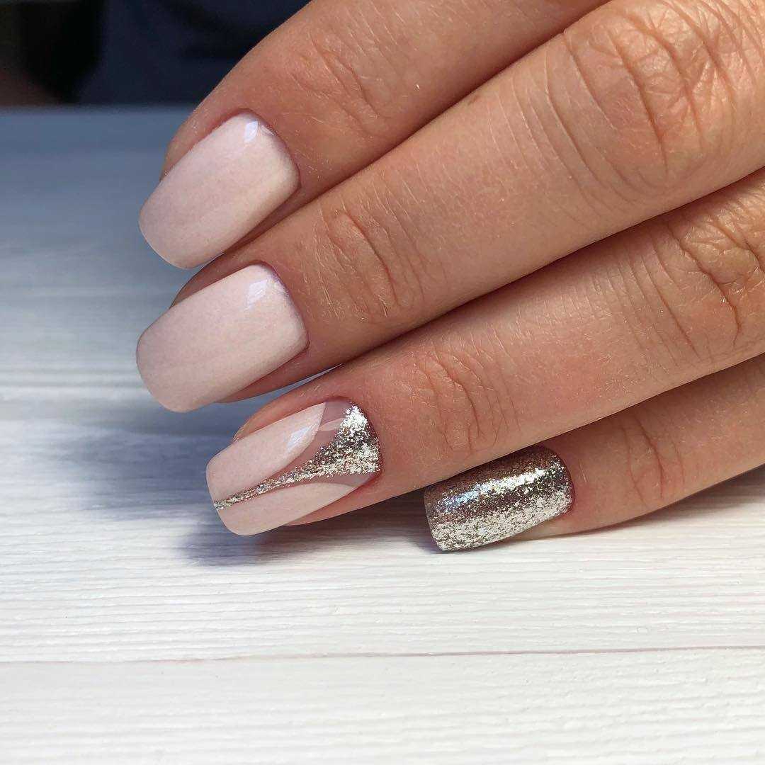Наличие коротких ногтевых пластин совсем не означает отказ от нюдового маникюра с использованием блестящих частиц. Вы можете красиво украсить кончики ногтевых пластин глиттером или подчеркнуть природный оттенок основания кусочками блестящей фольги. Вертикальные блестящие полосы, помогут визуально вытянуть форму ногтей. Также очень привлекательно смотрятся выделенные блёстками лунки или аккуратные рисунки, расположенные на нескольких пальцах, например веточка с блестящими листиками украшает ногтевую пластину большого пальца, а одиночный, словно оторвавшийся и унесённый лёгким порывом ветра листик, на другом пальце.