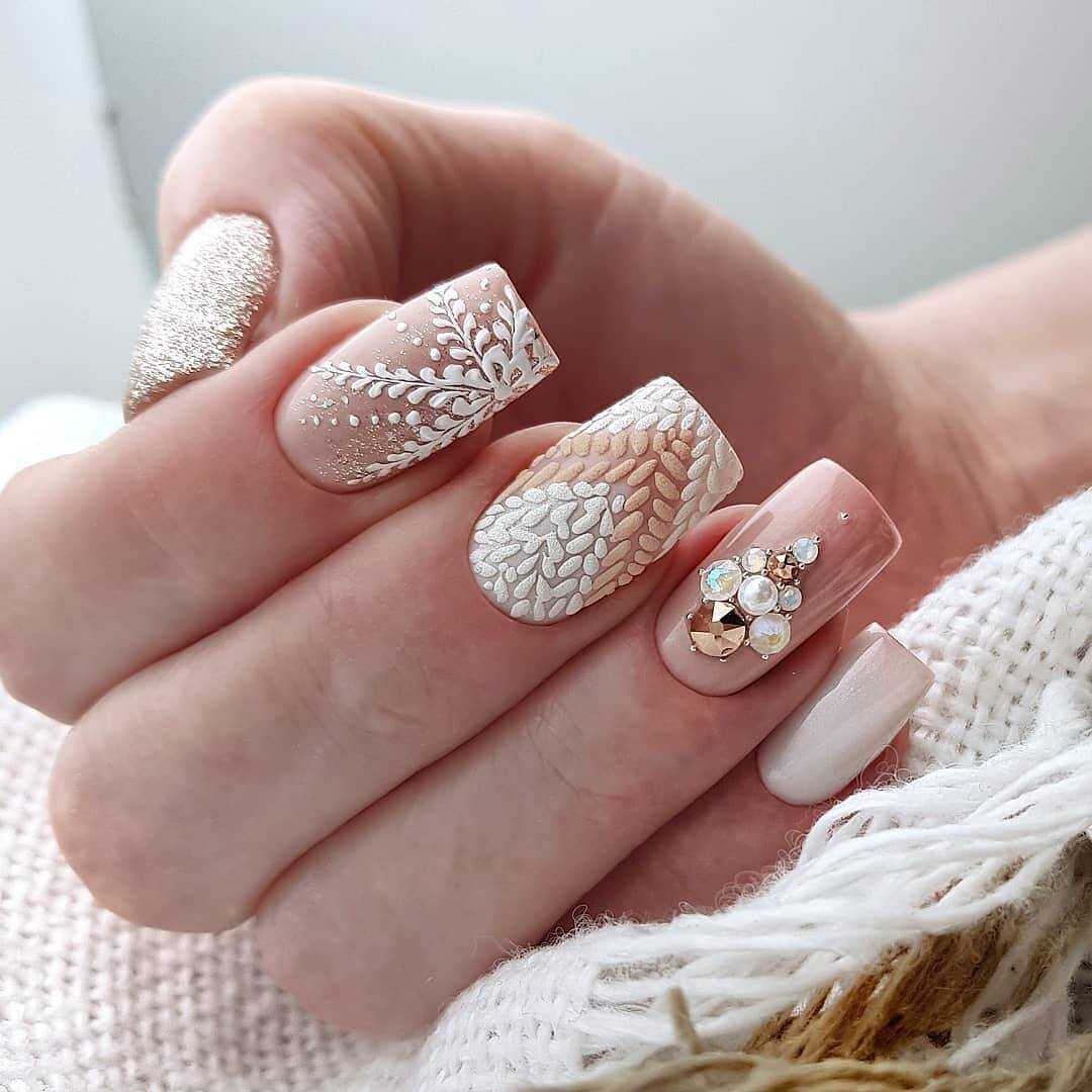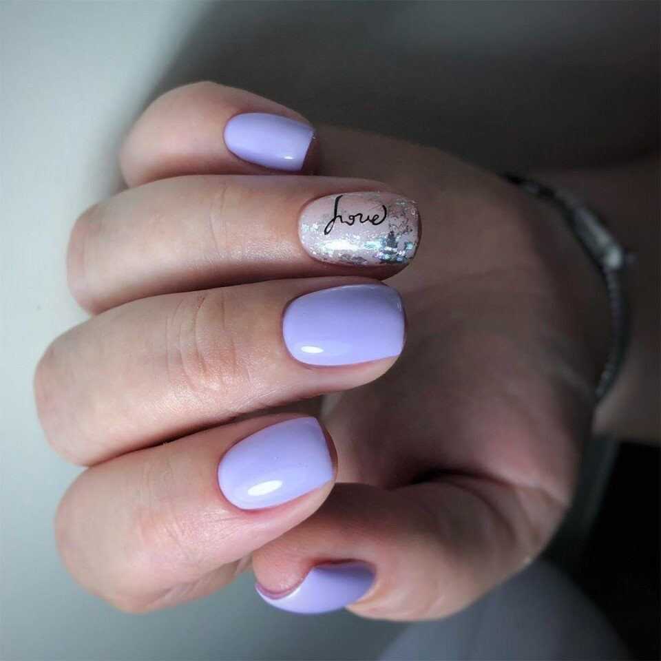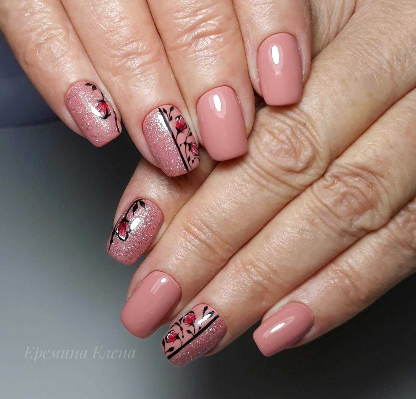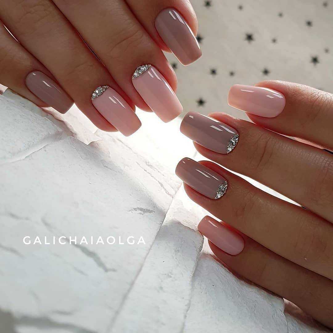 Наличие коротких ногтевых пластин совсем не означает отказ от нюдового маникюра с использованием блестящих частиц. Вы можете красиво украсить кончики ногтевых пластин глиттером или подчеркнуть природный оттенок основания кусочками блестящей фольги. Вертикальные блестящие полосы, помогут визуально вытянуть форму ногтей. Также очень привлекательно смотрятся выделенные блёстками лунки или аккуратные рисунки, расположенные на нескольких пальцах, например веточка с блестящими листиками украшает ногтевую пластину большого пальца, а одиночный, словно оторвавшийся и унесённый лёгким порывом ветра листик, на другом пальце.