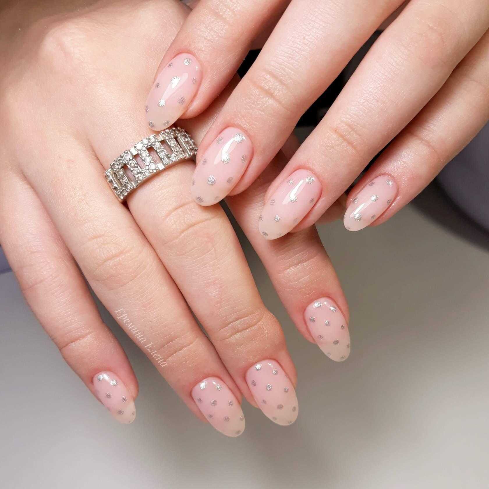 Стильные вариации оформления «milky nails» с блёстками на длинные ногти