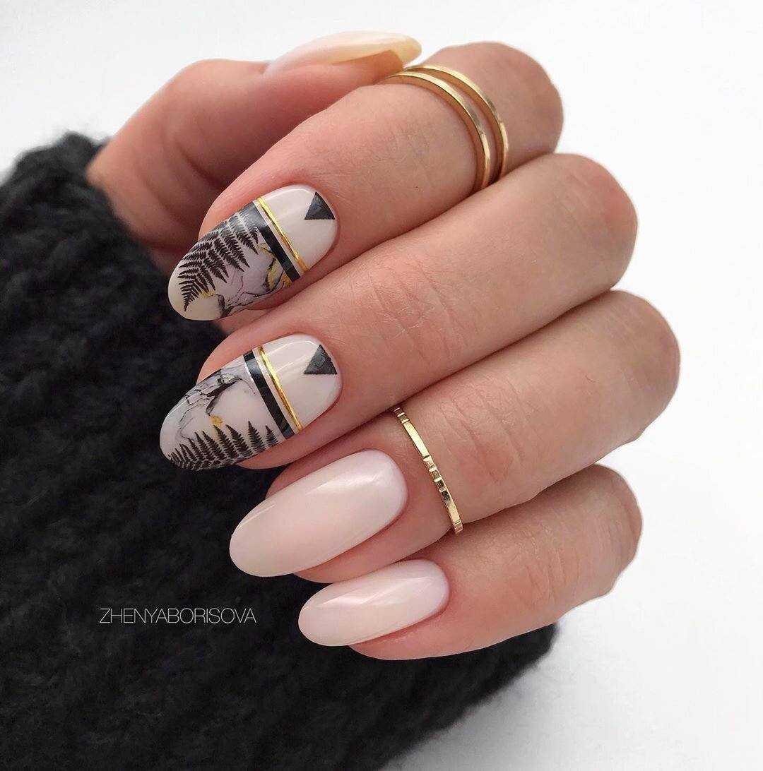 Контрастные нейл-арты всегда вызывали интерес у девушек. Сочетание светлых оттенков с черным цветом выглядит выразительно и очень заметно. На молочном фоне отлично смотрится темное кружево с добавлением шиммера, флористика с веточками и нежными листьями.