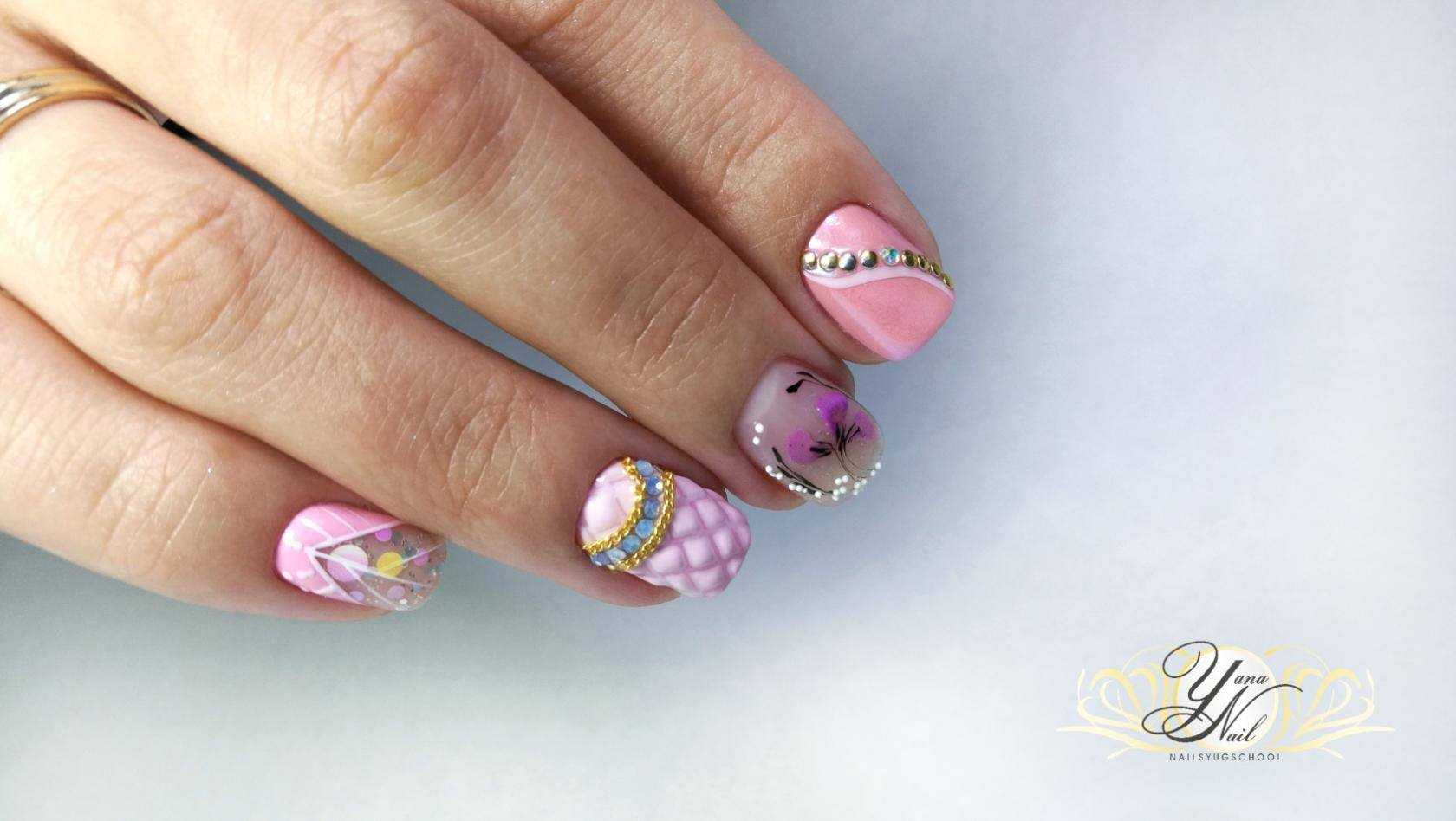 Он как воздушная, сладкая вата. Он вызывает самые приятные впечатления. Для того чтобы придать ему большей изысканности, многие украшают его дополнительными деталями. Нежно розовый маникюр с кружевной росписью – это настоящий шик. Собираетесь на торжество? Добавьте к такому маникюру россыпь страз, которые могут украшать 1-2 ногтя. Из страз легко выложить различные узоры или просто создать эффект капелек.