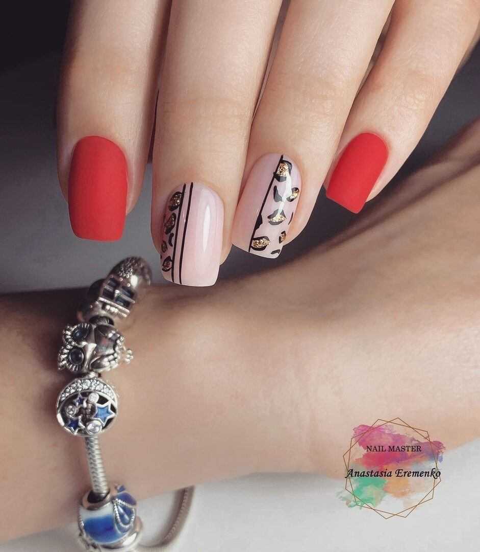 Как мы уже говорили в начале нашего обзора, для создания модного дизайна на коротких ногтевых пластинах можно использовать многие оттенки покрытий, например, красный, белый, бордовый, графитовый, беж или синий. При этом блёстки могут быть рассыпчатыми или входить непосредственно в состав лака. Однотонный дизайн с блестящим акцентным ноготком, сверкающие переливающиеся растяжки, лунки и улыбки – вариаций множество. Короткие квадратные ноготки с такими примерами оформления смотрятся необыкновенно мило и очаровательно. В списке топовых принтов оригинальные леопардовые пятнышки с блестящей прорисовкой, миниатюрные цветочки и композиции из геометрических фигур, всевозможные полоски и блестящие мазки кистью. Такие ноготки не оставят ваши ручки без внимания.