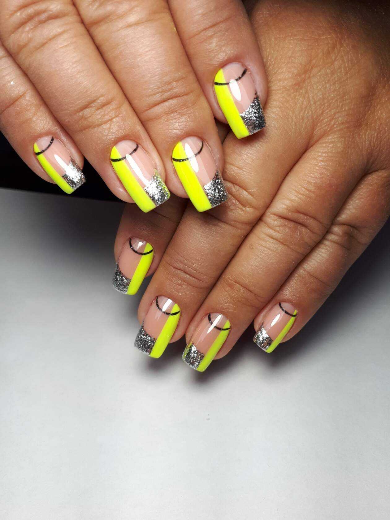 Вариации маникюра с блестящими частицами на коротких квадратных ногтях
