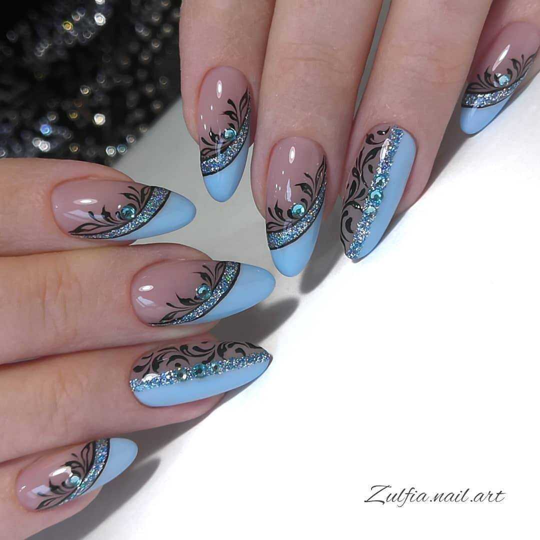 Вызывает яркие ассоциации: небо, солнце, песчаный пляж. Именно этот вариант станет прекрасным дополнением к пляжному образу. Он как морская волна, как воздушные облака. Популярный французский маникюр отлично сочетается с голубым оттенком гель-лака. Нежный летний маникюр может быть выполнен не только в классическом голубом цвете, но и с бирюзовым оттенком.