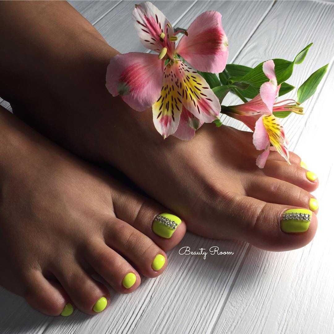 Как известно, молодое поколение испытывает некую слабость к всевозможным неоновым оттенкам и колерам в стиле «вырви глаз», поэтому дизайнеры предложили уверенно использовать подобные варианты покрытий для создания модного летнего педикюра. Это может быть однотонный дизайн, выполненный неоновым жёлтым, лимонным, зелёным, голубым или розовым цветом, педикюр с яркими рисунками, геометрическими композициями, элементами «негативного пространства» или растяжкой. Столь броские цвета можно дополнительно комбинировать с классическим белым либо чёрным цветом, дополнять объёмными украшениями и прочим декором