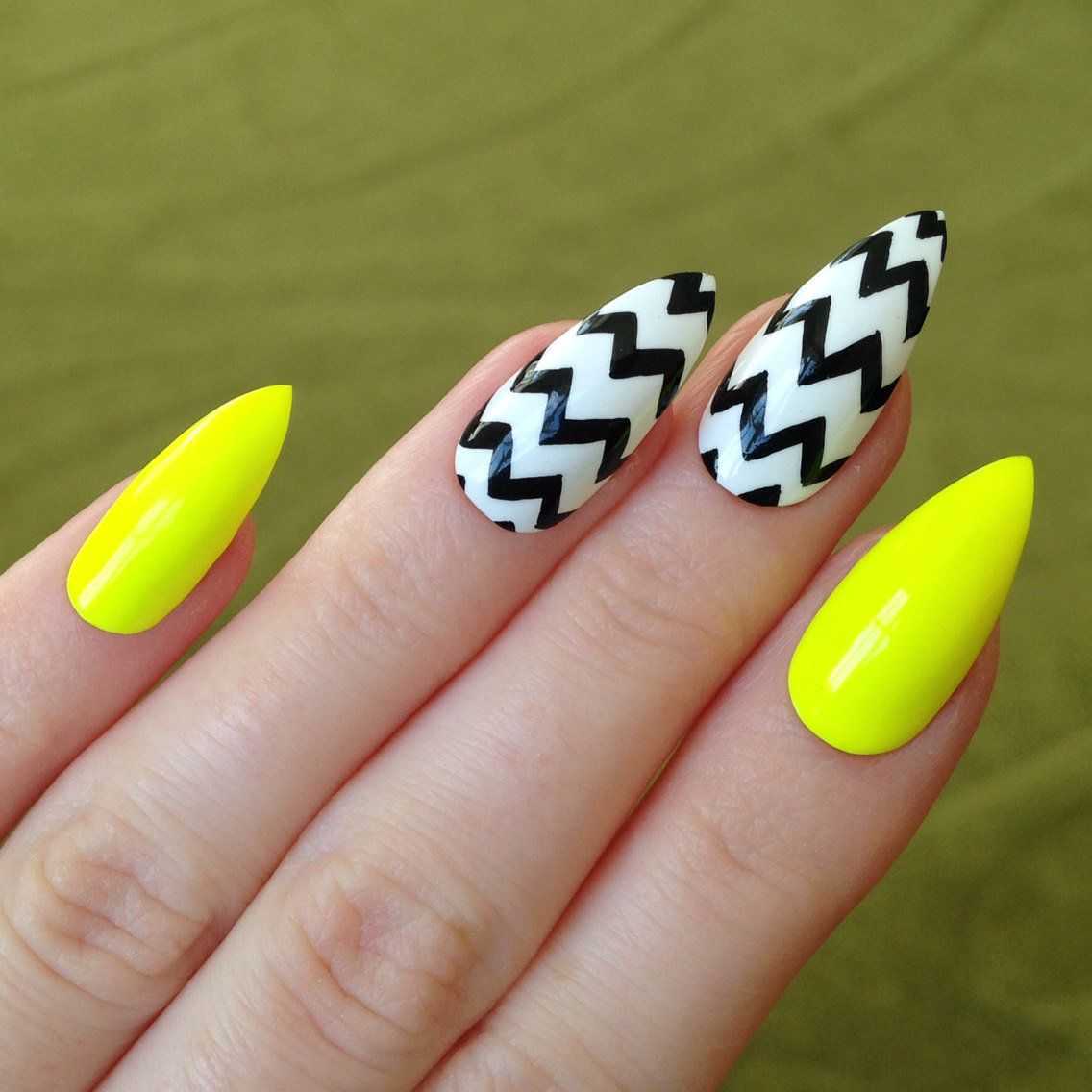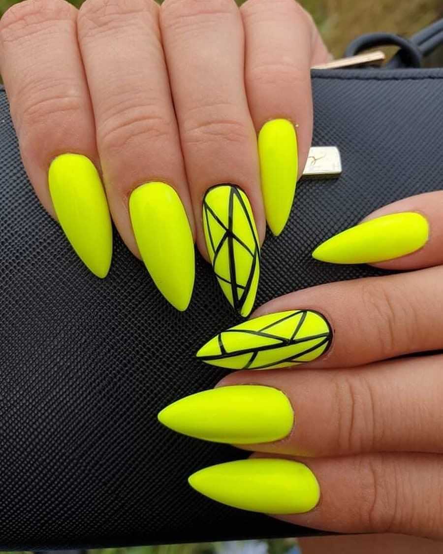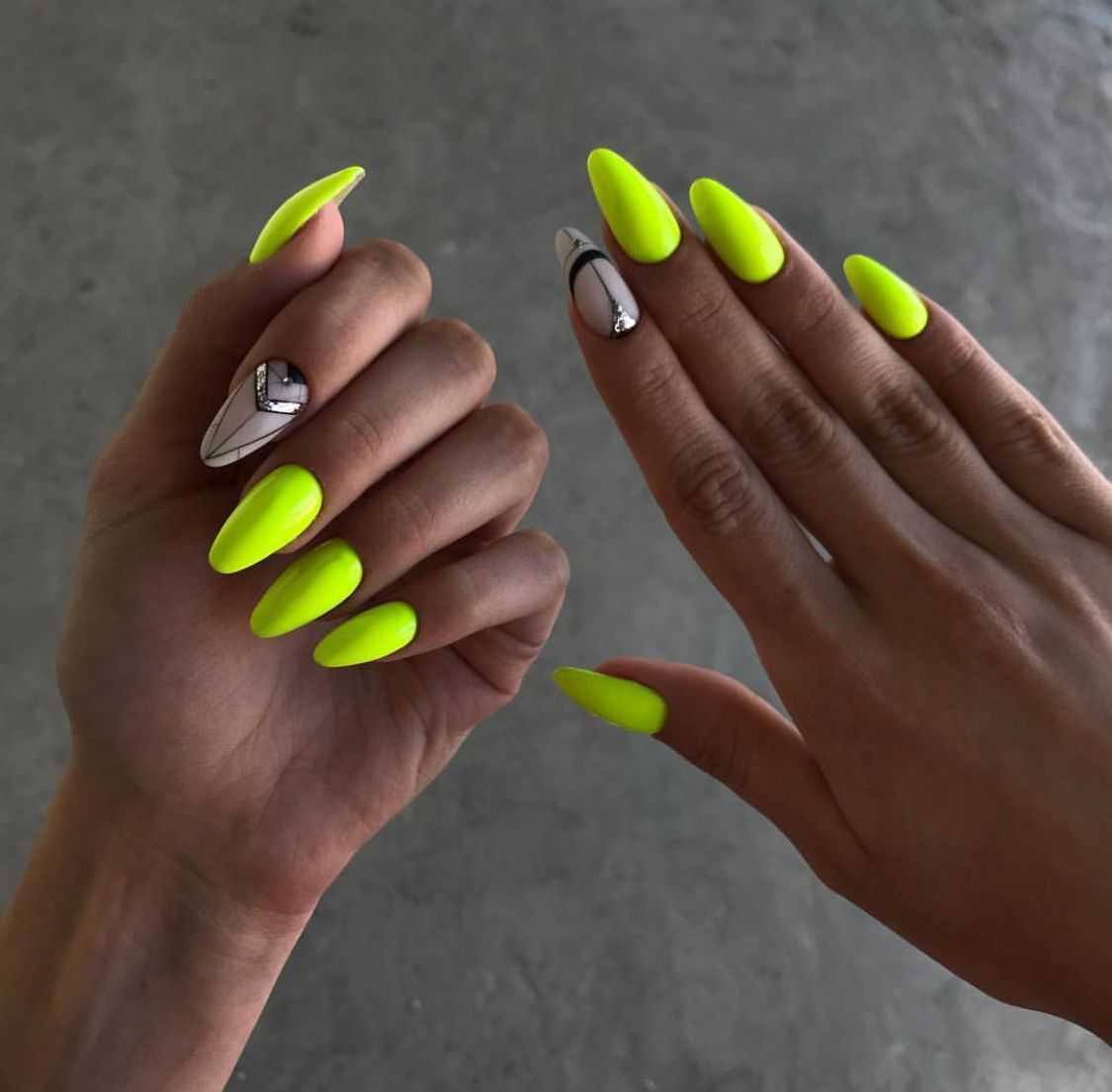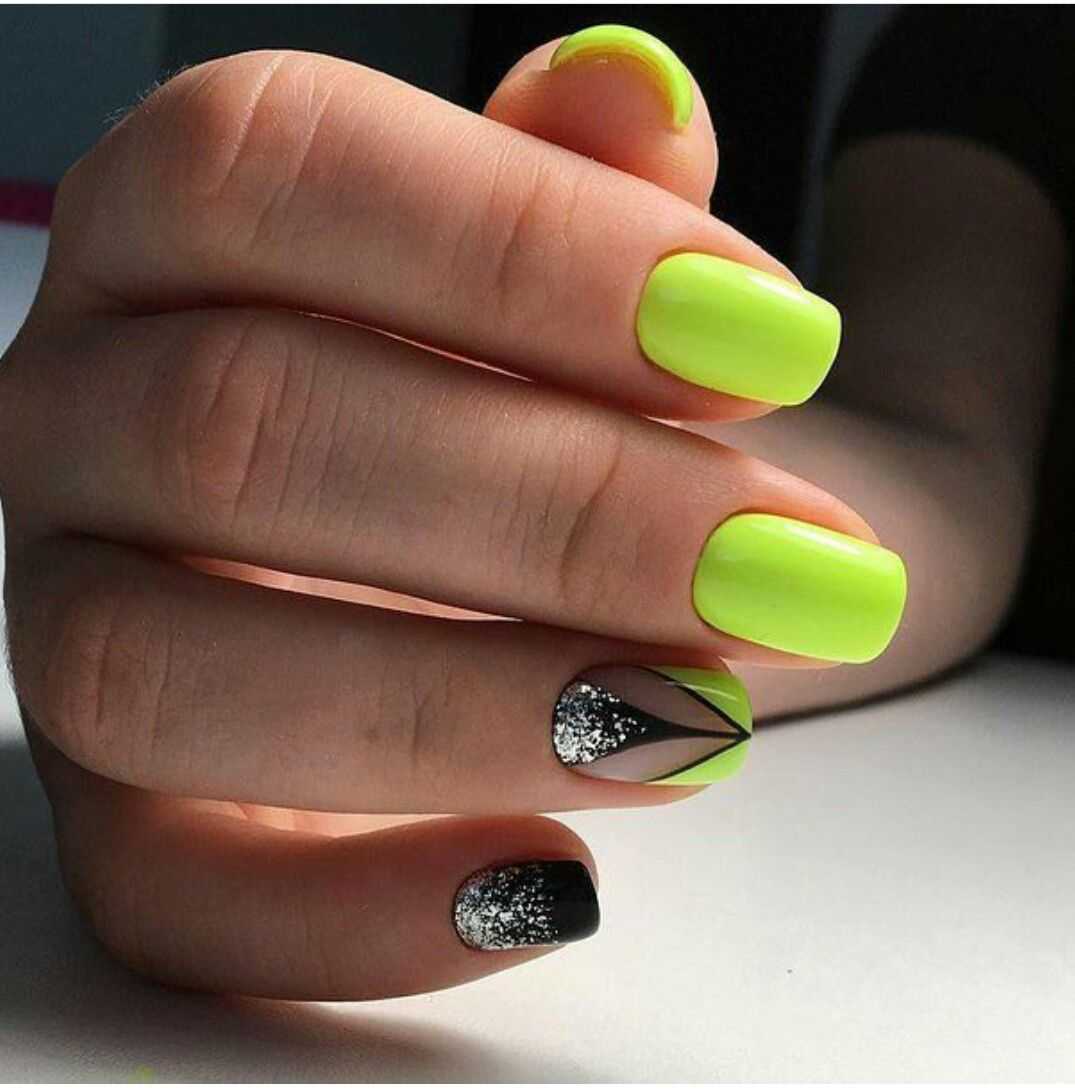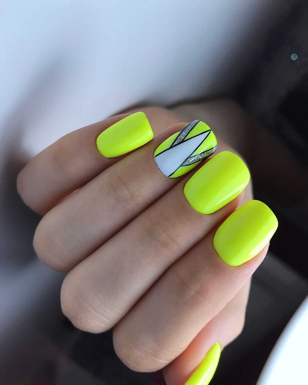 Шикарно смотрится желтый неоновый оттенок в сочетании с розовым цветом. Используйте технику “разные ручки”. Желательно не дополнять маникюр другими оттенками или декором. Неоновые тона и без того смотрятся достаточно ярко, поэтому дизайн лишь усложнит нейл-арт.
