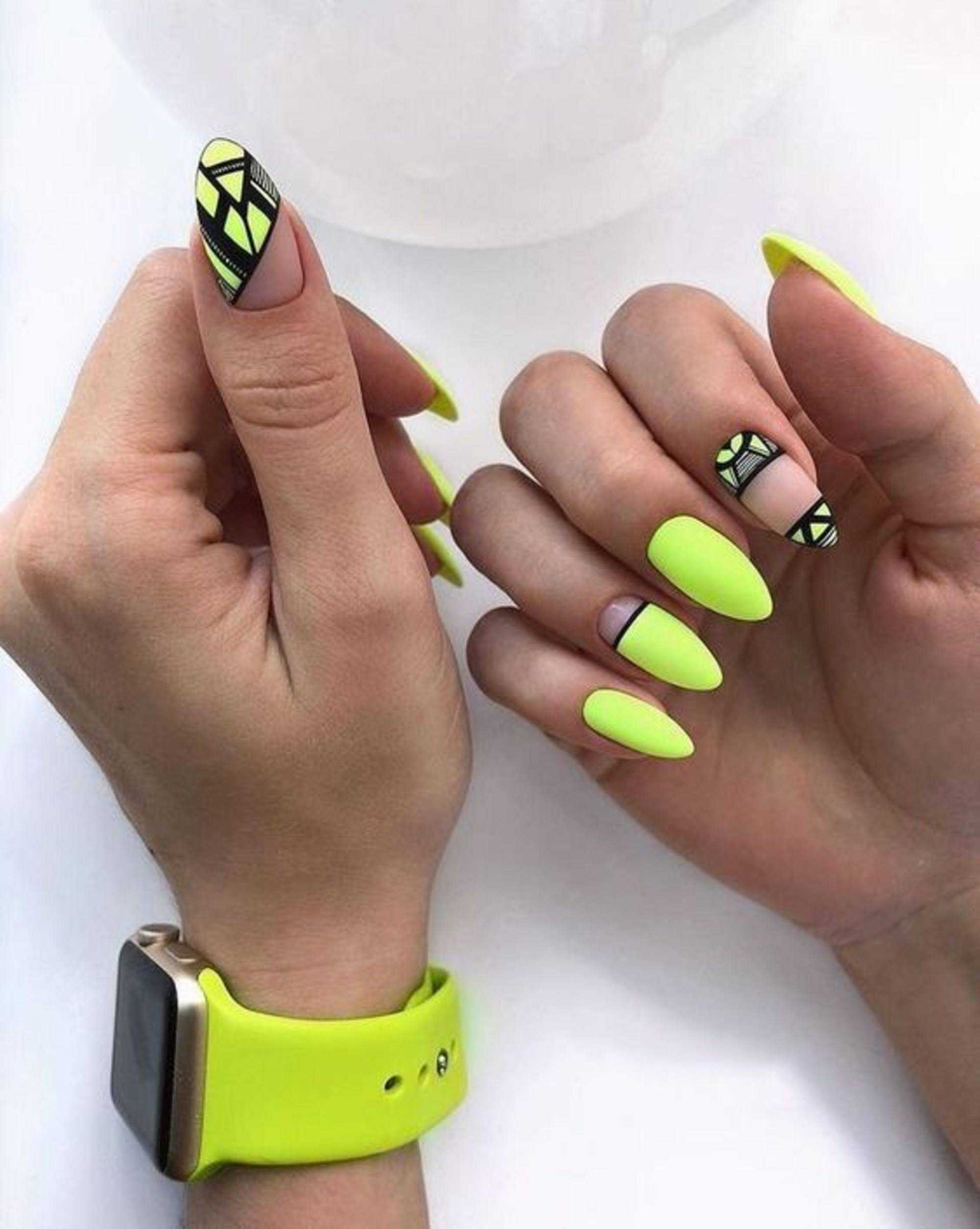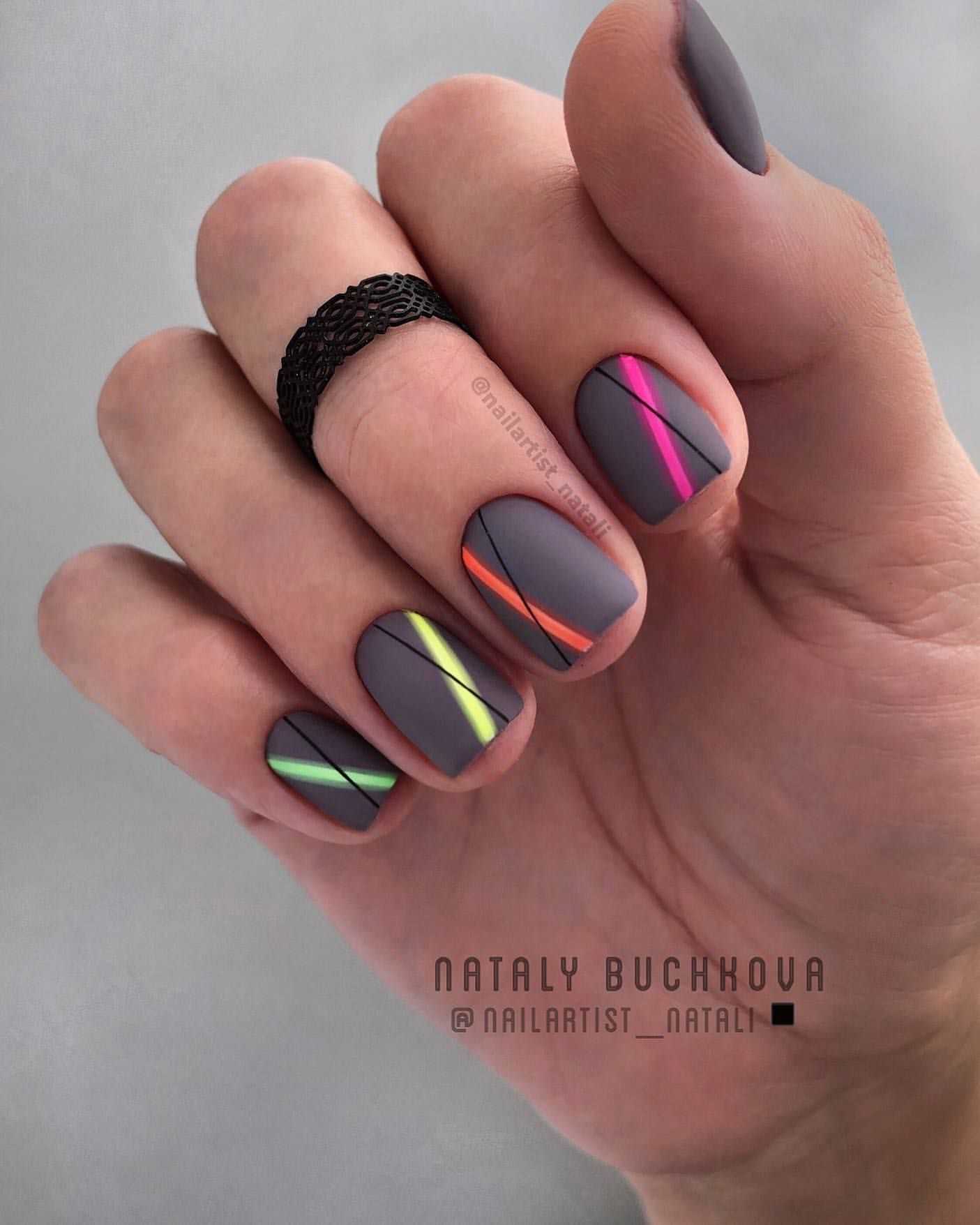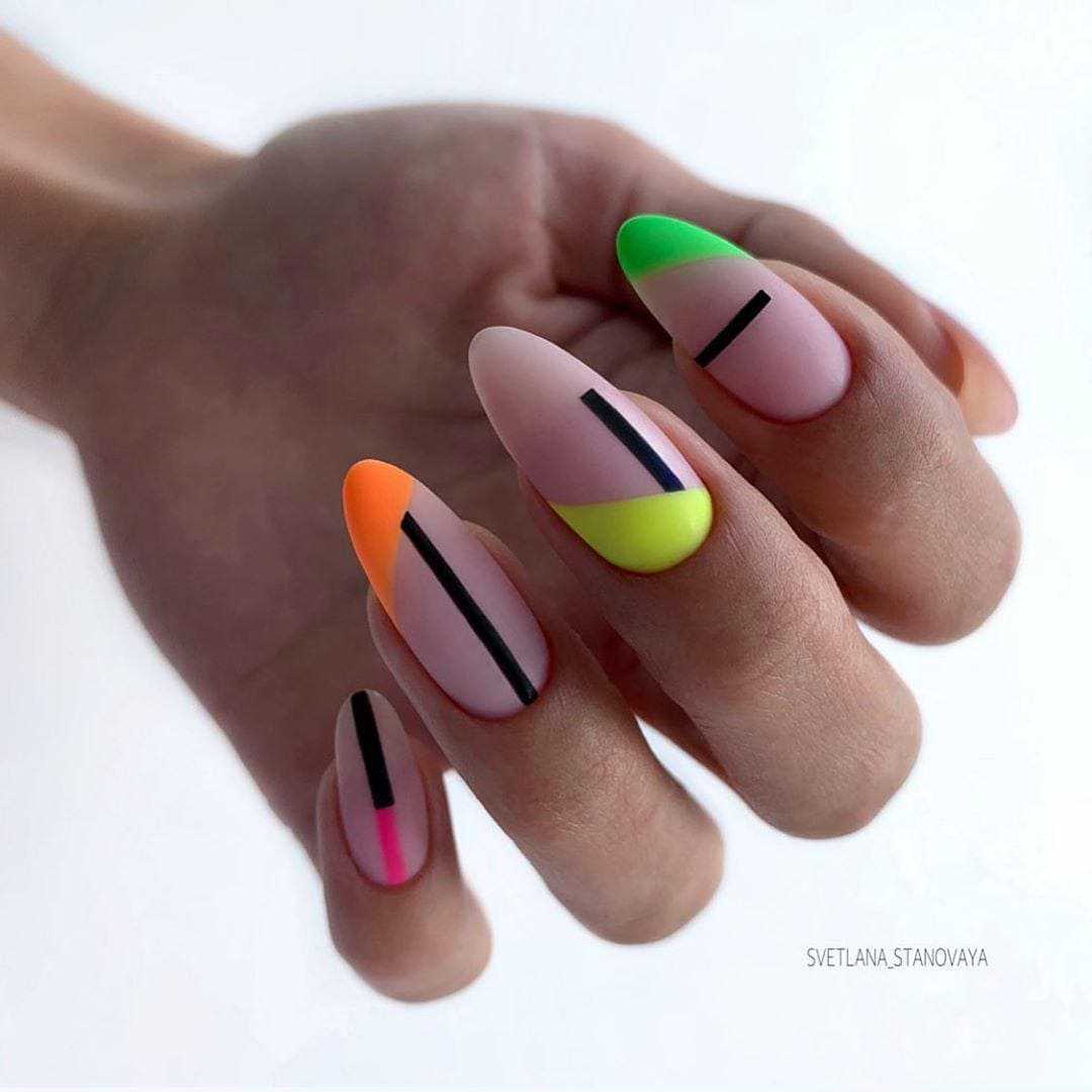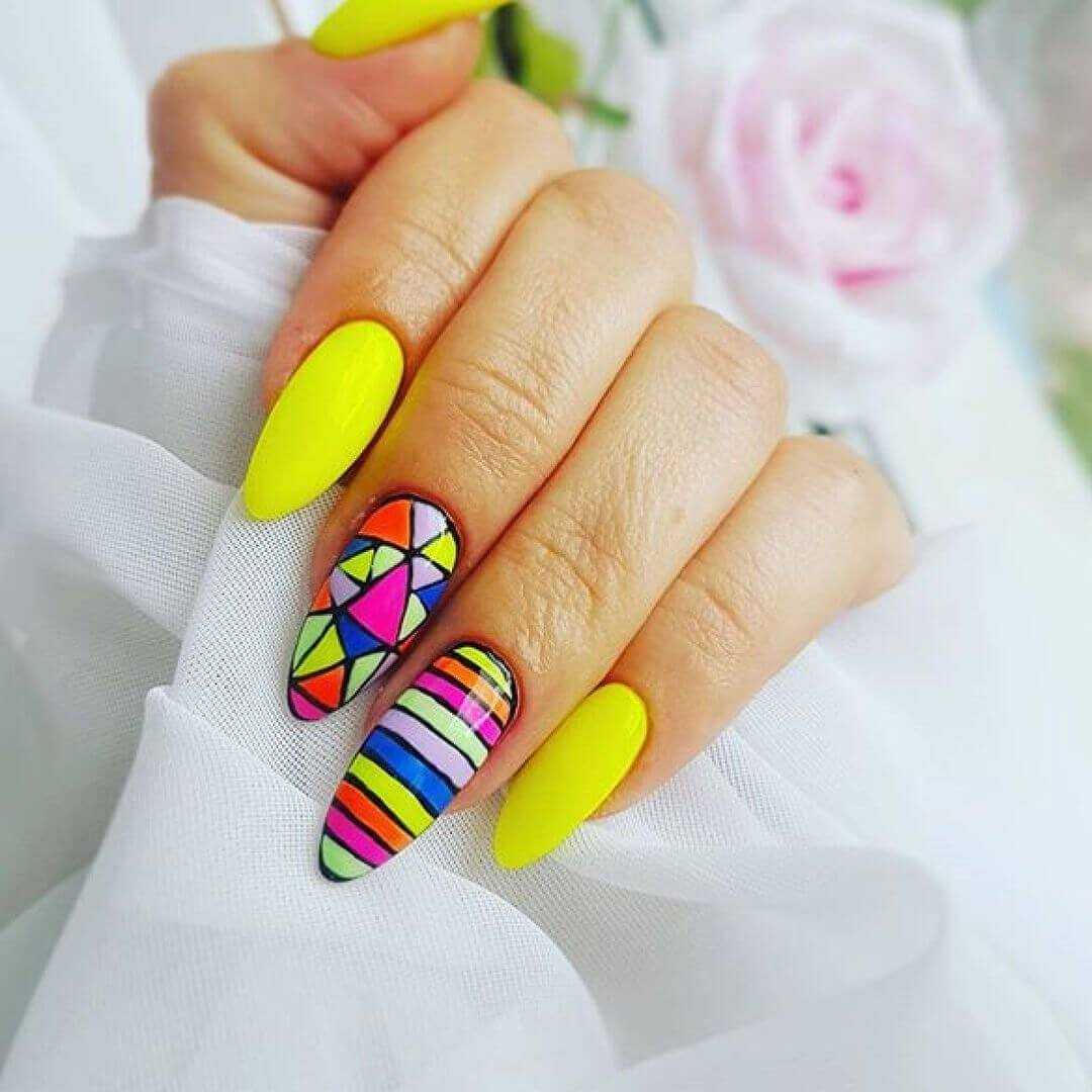 - Геометрия в рисунках. Простые узоры сегодня очень актуальны. Вы можете покрыть одним неоновым оттенком все ноготки, а затем нарисовать на них ровные полоски другим контрастным или близким цветом. Чтобы сделать аккуратный полосатый маникюр, можно использовать специальную ленту.