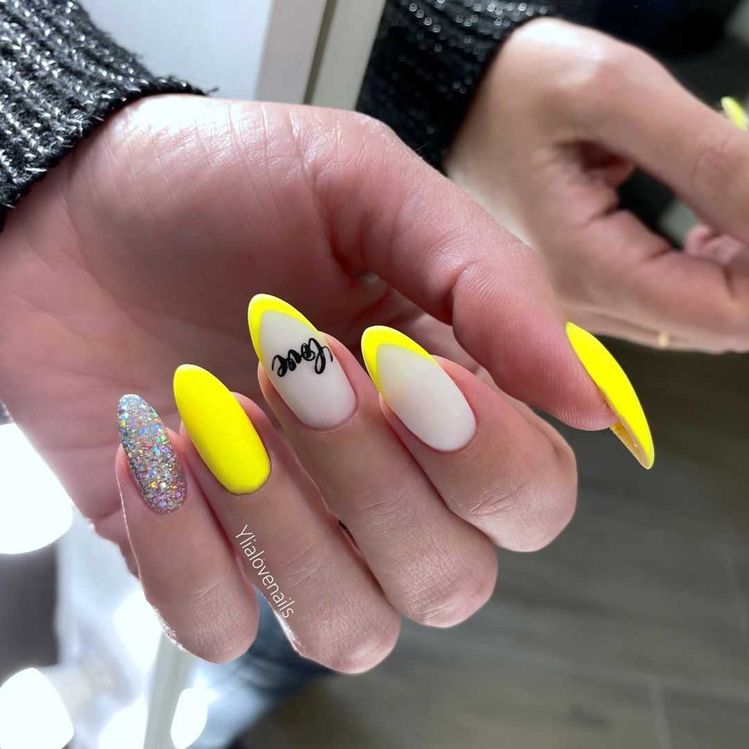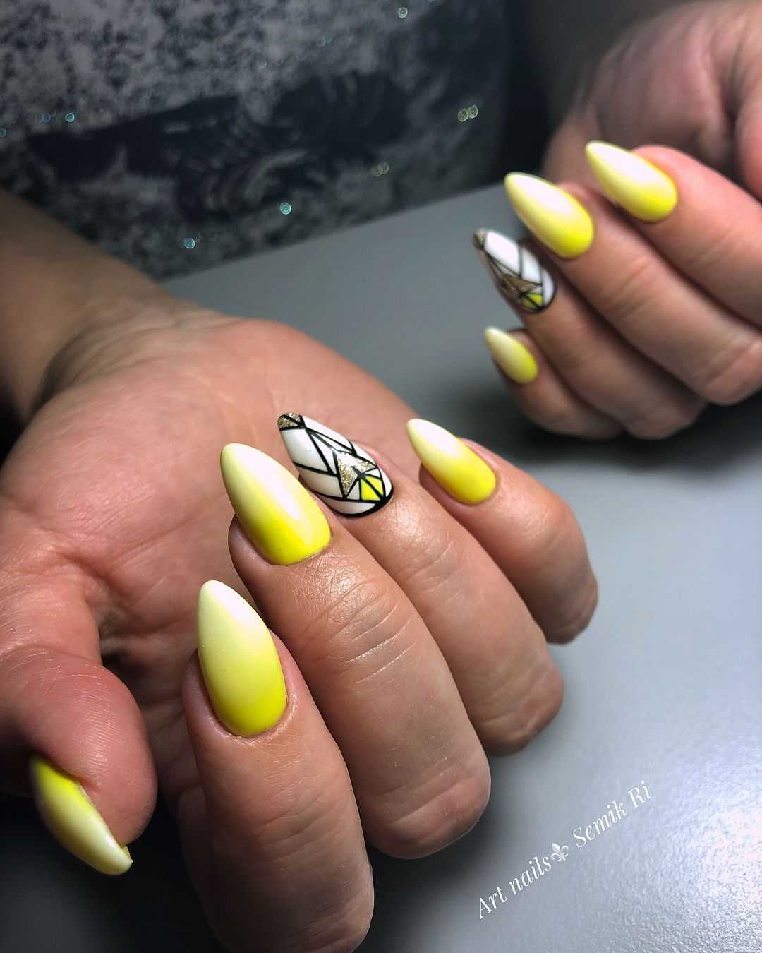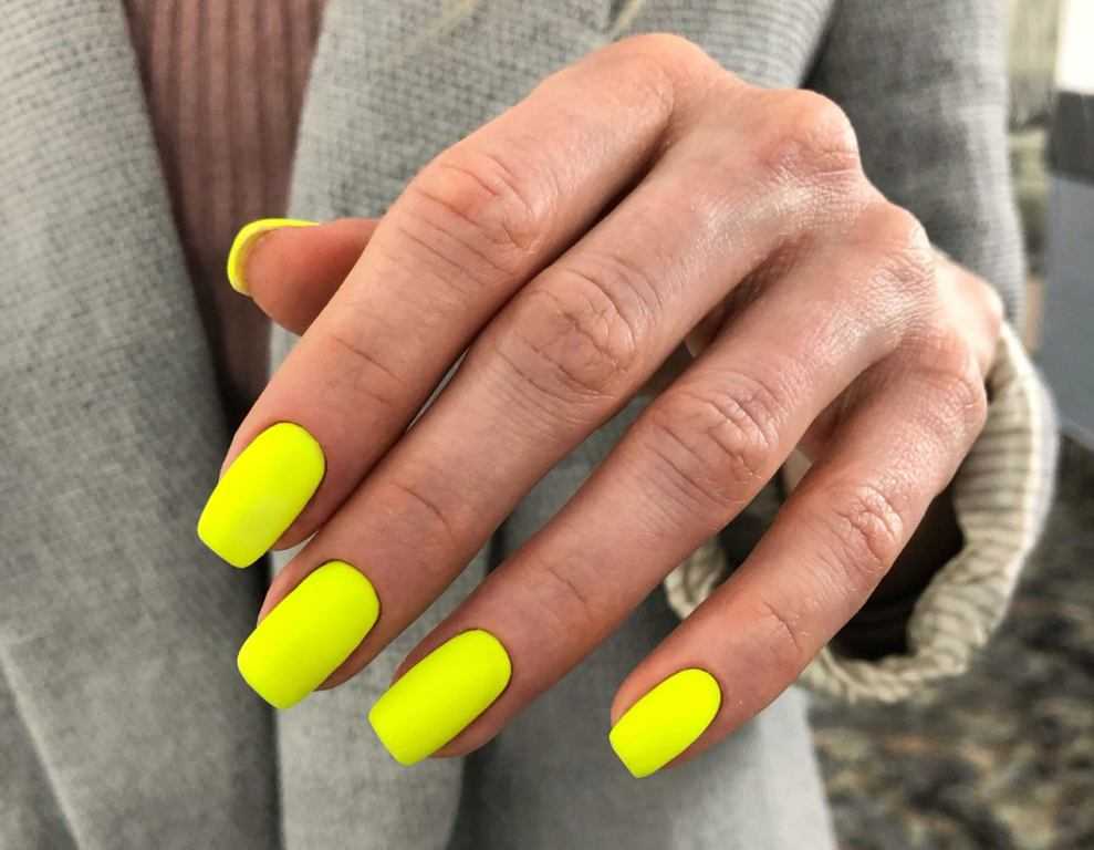 Желтый оттенок вновь на пике популярности. Мягкий и нежный цвет особенно актуален в летний период, в остальные сезоны на его смену приходит горчичный цвет. Полное покрытие ногтей неоновым желтым цветом подходит далеко не всем. Дизайн выглядит экстравагантно и очень ярко, поэтому выполнять его для повседневного образа не рекомендуется.