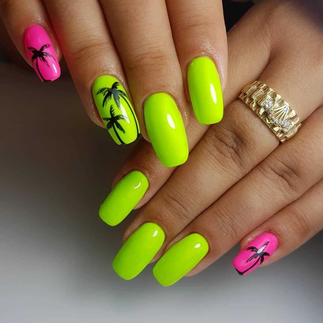 Все яркие оттенки роскошно светятся под лучами неоновой лампы и понравятся девушкам-подросткам, которые любят ночные дискотеки, вечеринки. Это прекрасный вариант для отпускного летнего маникюра. На пляже возле моря с таким дизайном ногтей вы будете выглядеть вполне уместно.