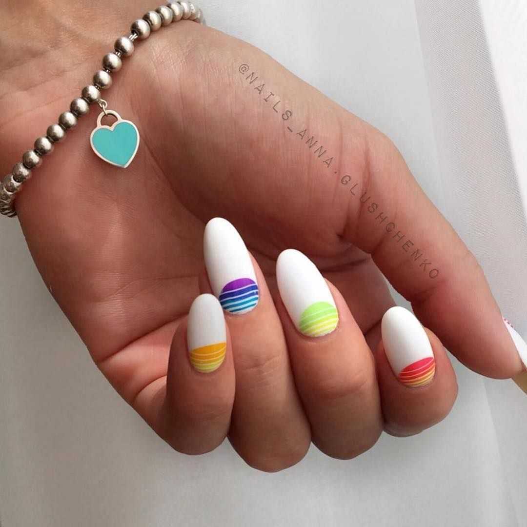 Здесь важно найти баланс и выбрать что-то одно: или маникюр с неоновыми лаками и одежда в спокойных тонах, или кричащая одежда и спокойный дизайн ногтей. Контрастные ногти прекрасно гармонируют с любой белой, синей и бежевой одеждой