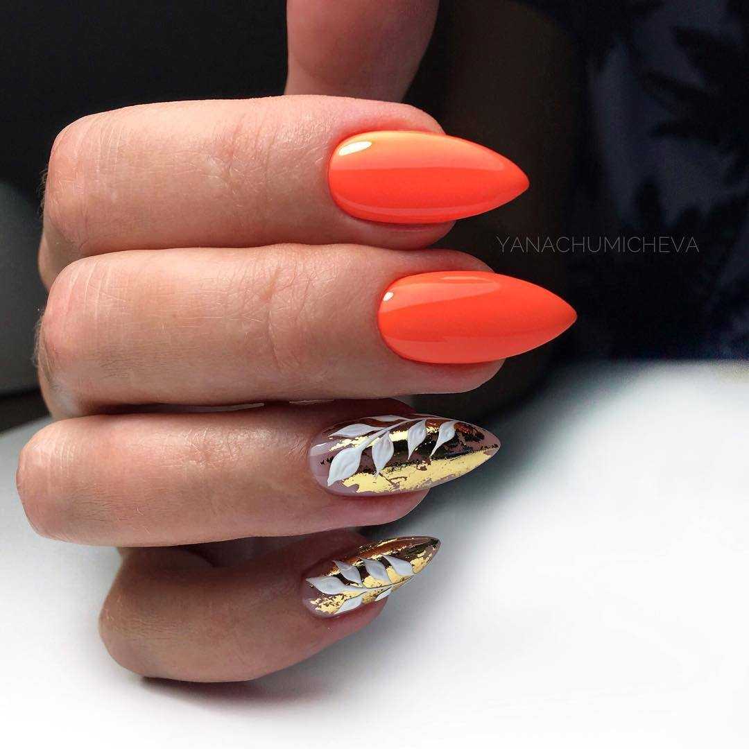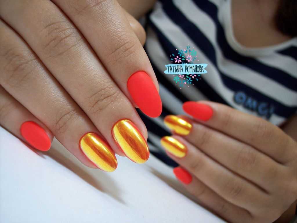 Рисунки и стразы отлично смотрятся на фоне ярких красок. Как вариант, используйте одновременно несколько текстур в одном маникюре, тогда огненный цвет будет выглядеть на ваших ногтях еще привлекательнее.