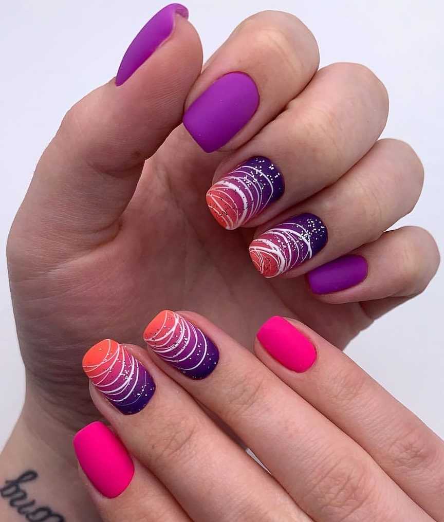 С помощью градиентного маникюра получится показать красоту сразу нескольких оттенков. Используйте все разнообразие неоновых тонов в одном нейл-арте. Яркие оттенки хорошо растушевываются и гармонируют друг с другом.