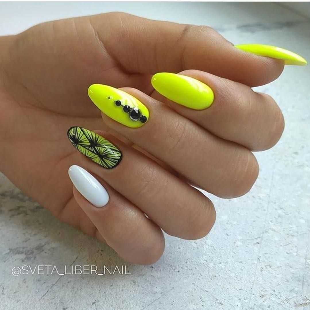 С зеленым цветом отлично гармонирует фруктовый дизайн. В тренде маникюр с фруктами в разрезе. Особенно красиво выглядит дизайн с лаймом, лимоном или апельсином. Зеленый неоновый цвет может использоваться в качестве дополнения геометрического дизайна или маникюра с флористикой. Используйте темные узоры стемпингом с веточками и листьями. На фото ниже вы можете видеть пример такого стильного дизайна ногтей.