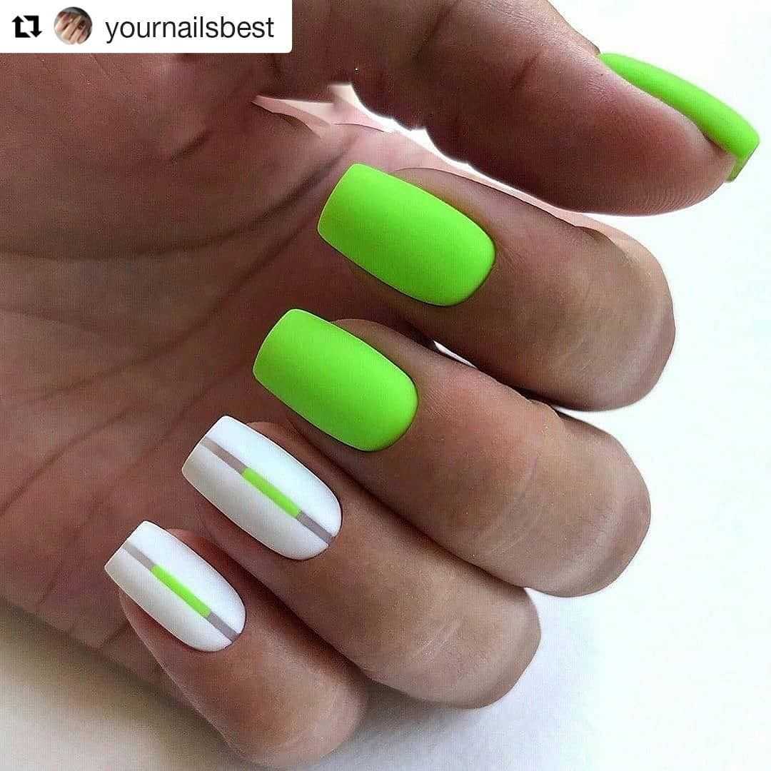 Зеленый оттенок отлично вписывается в летние образы. Оттенки освежает и облагораживает ноготки, выглядит сдержанно и достаточно ярко. Зеленый неоновый маникюр красиво смотрится с трафаретными узорами. При этом можно использовать белый, черный, золотой или серебряный оттенки.