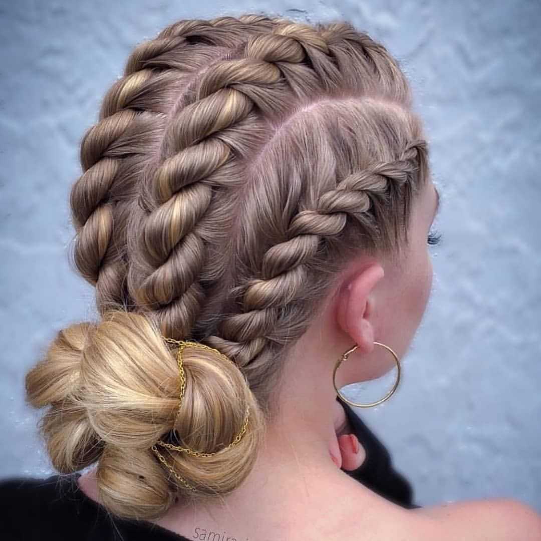 - косы с металлическими цепями — плетутся по бокам головы, цепь должна быть контрастного цвета, на затылке все крепится резинкой в хвост (оставшиеся пряди укладывают выпрямителем);