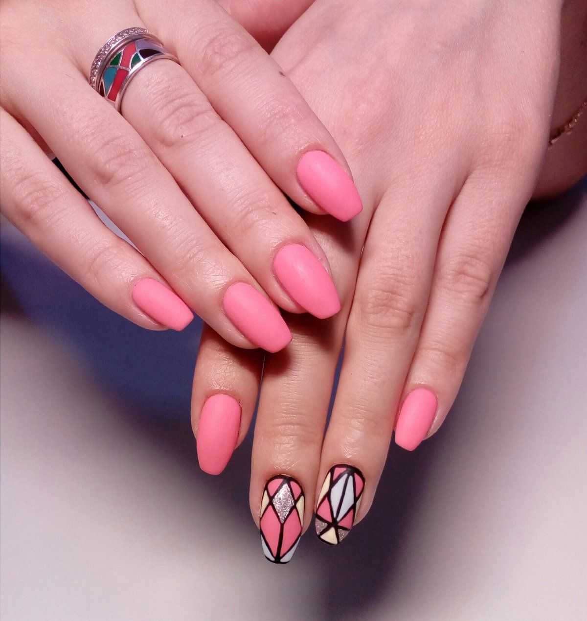 Точки, полосы, а также геометрические фигуры — все это выглядит невероятно красиво и современно. С таким дизайном можно проявить свою фантазию и создавать самые необычные узоры на овальной форме ногтей.