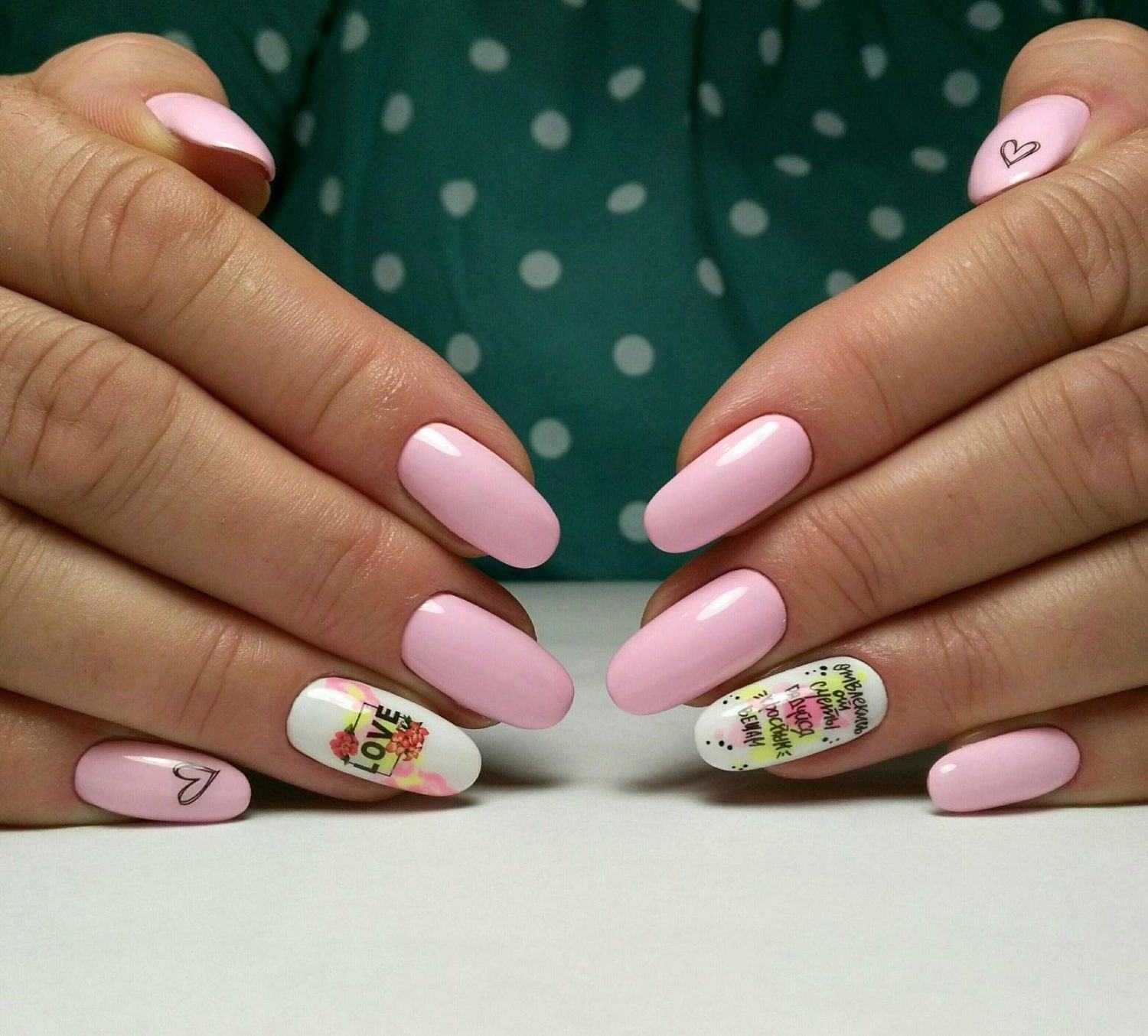 Лаконичные и вызывающие внимание надписи, станут прекрасным дополнением к вашему маникюру на овальную форму ногтей в сезоне 2020-2021. Смысл, который вкладывается в слово или фразу, может быть самым разнообразным, часто девушки выбирают слова: «love», «angel», «sweet», «amour», «soul», «happy», «люби» «ой, все» и многие другие