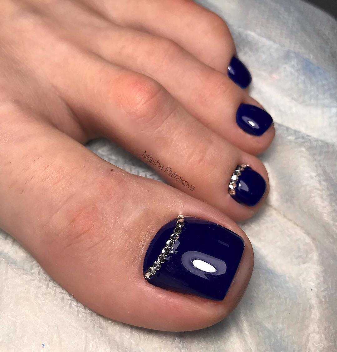 Такая идея обязательно придётся по вкусу ярким особам, которые не сомневаются в своей привлекательности и привыкли к повышенному вниманию. Использование в педикюре страз разной формы, размера и окраса позволяет воплощать в реальность самые потрясающие идеи. Блестящие украшения могут дублировать оттенок покрытия на ноготке, или наоборот, контрастно отличаться. Из страз можно выкладывать потрясающие узоры, выделять кончик или основание ногтевой пластины, украшать ноготок блестящей россыпью либо покрывать декором полностью весь ноготок. Сияние страз дополняет гламурными нотками любое покрытие и подчёркивает изысканный вкус барышни.