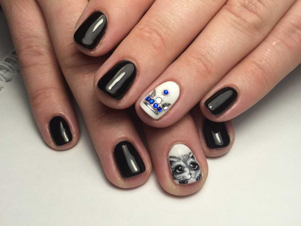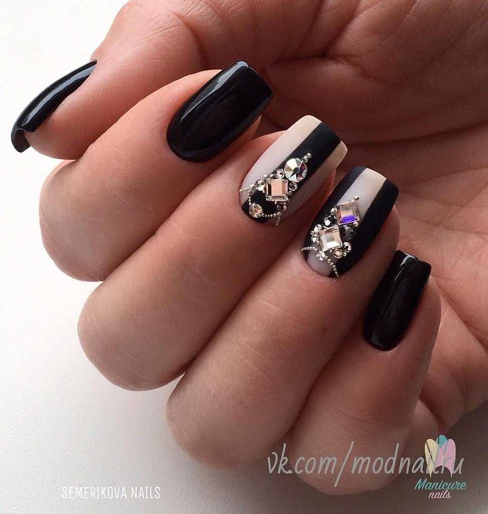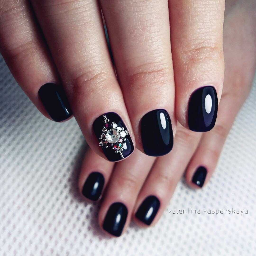 Элегантный маникюр черного цвета с яркими камушками считается прекрасным вариантом для праздничного события или торжественного мероприятия. Этот насыщенный цвет утонченно сочетается со стразами любой формы, цвета или размера. Украсить ноготки нежной россыпью самых маленьких кристаллов или же выполнить нежный узор на нескольких ноготках. Располагать элементы декора можно в любой зоне ноготка. Сверкающие стразы выглядят одинаково привлекательно как на краю ногтевой пластины, так и в любой его зоне. Главное, не перегрузить общий дизайн, чтоб не получить слишком грубый эффект.
