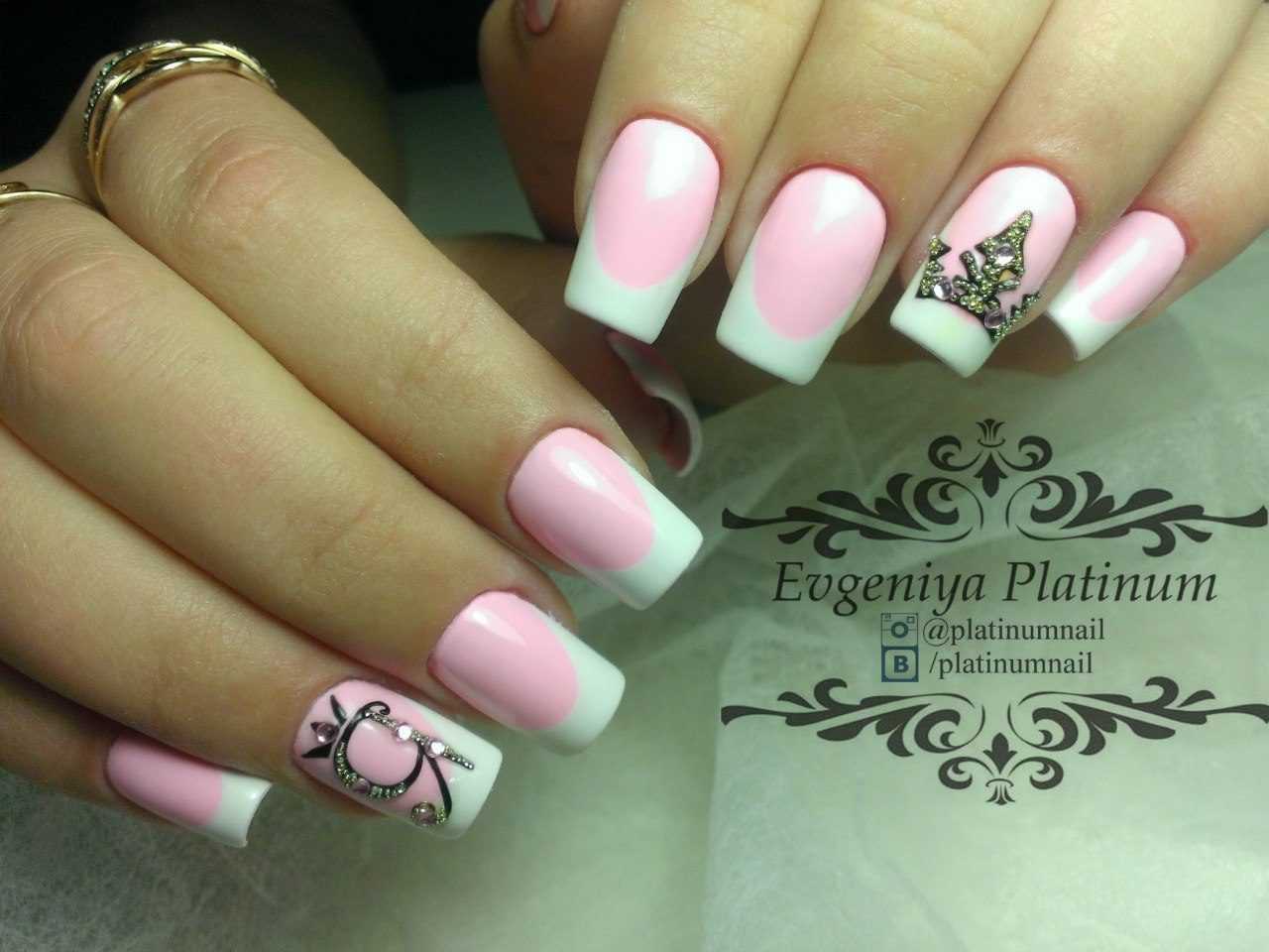Френч со стразами может оформляться в любой комбинации оттенков, но особое внимание, всё-таки, стоит уделить классическому варианту. Нюдовое, прозрачное, бледно-розовое или нежно-персиковое основание с белоснежным кончиком смотрится само по себе очень женственно и элегантно, а блестящие детали в виде оригинальных узоров сделают оформление ещё изысканней