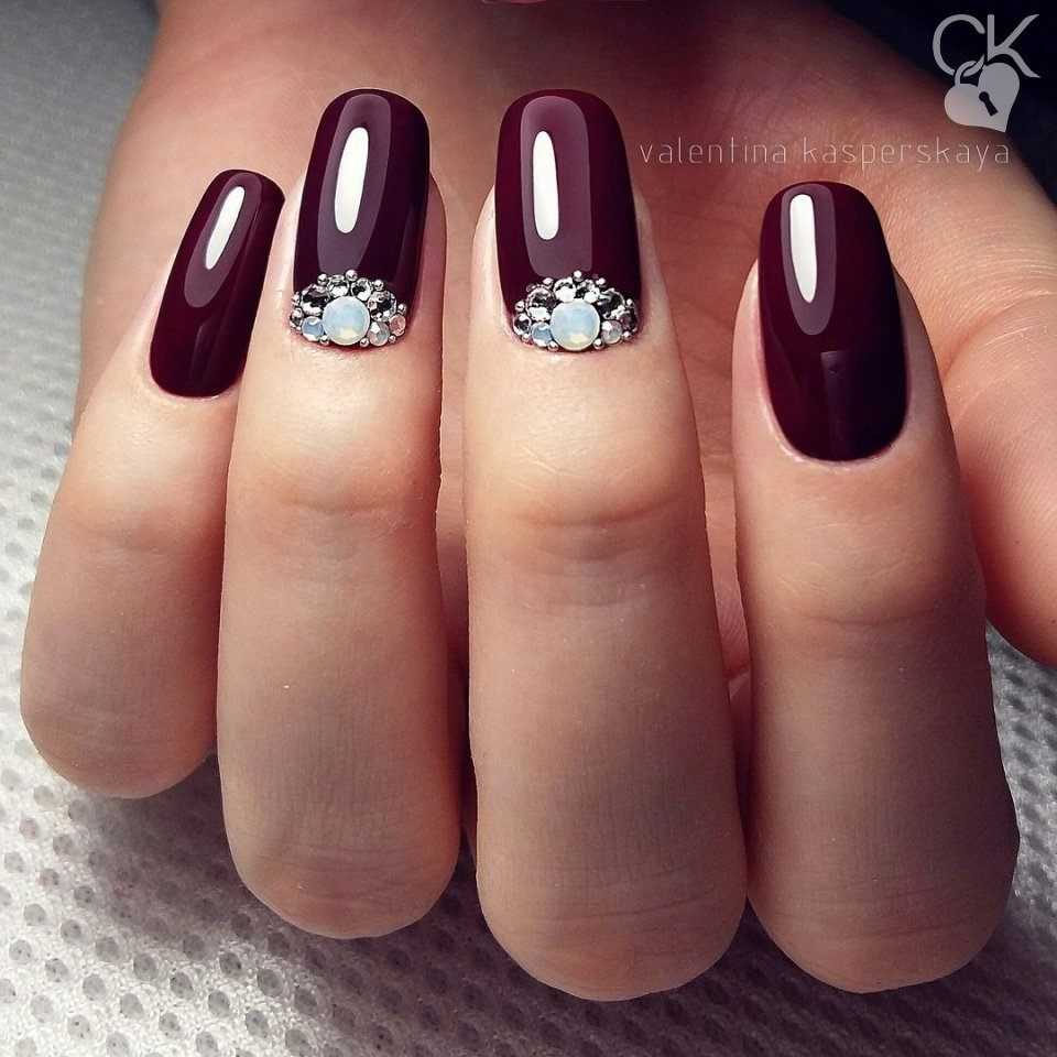 В тренде бордовый, вишневый, винный оттенки. Они отлично гармонируют со стразами, бульонками