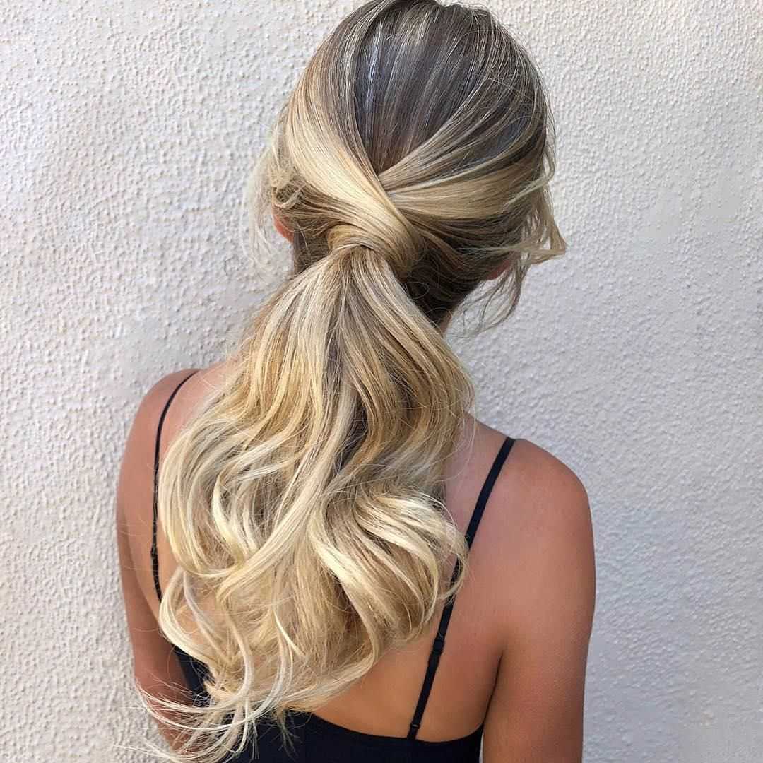 Ярко и эффектно выглядит гладко зачесанный конский хвост. Для этого волосы собираются на макушке и завязываются силиконовой резинкой. Вытянутой прядью закручивается основание хвоста.