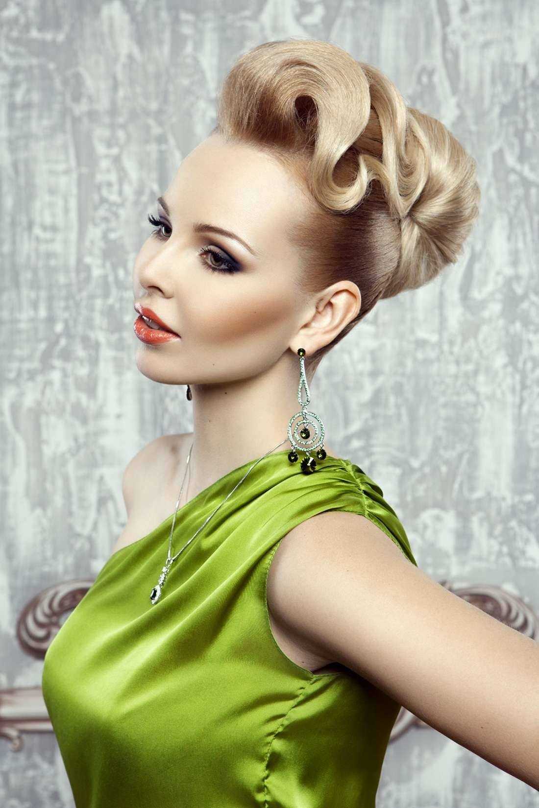Стильный вариант своими руками в стиле 50-х годов — прическа-пучок на длинные, средние или короткие волосы с начесом на макушке. Необходимо работать по такому алгоритму: