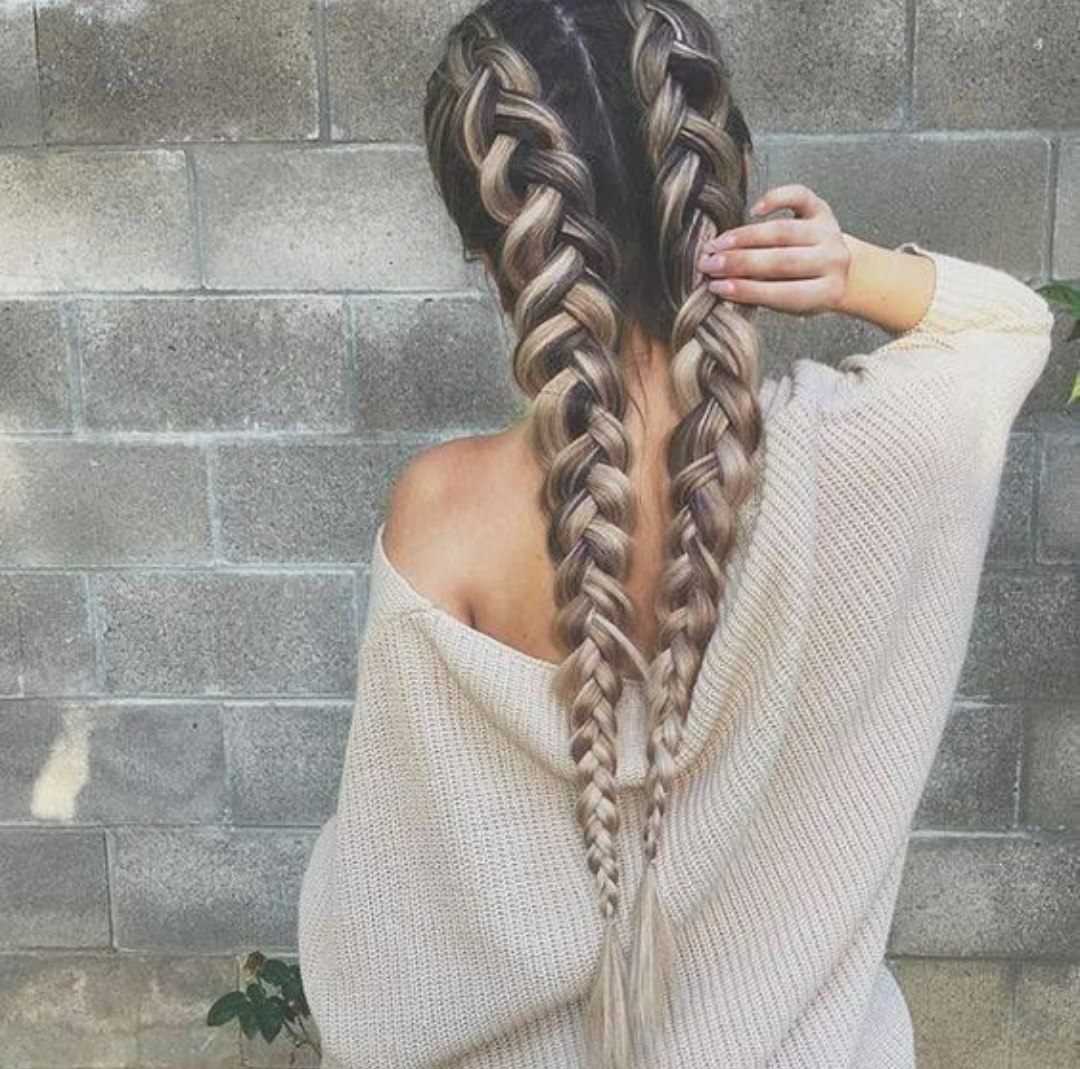 Французская коса не перестает удивлять своими разновидностями. Заплетите косы с верхним подхватом в области лица с обеих сторон. Кончики волос заплетите таким же способом и соберите резинкой. Легкая укладка из косичек на каждый день готова.