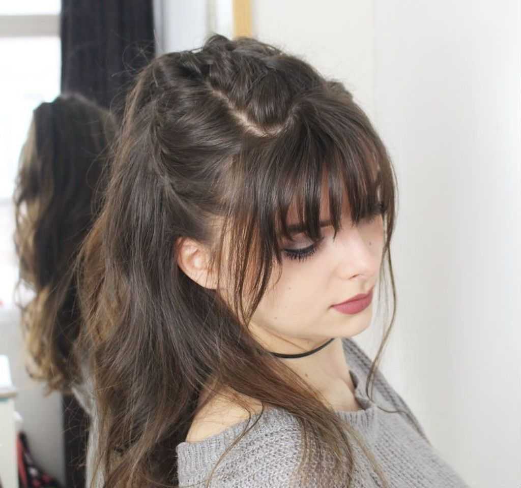 1) Прическа с заплетенной челкой. Для начала плетем косичку, например, колосок, а затем вплетаем челку в эту косичку. Получается открытый лоб.