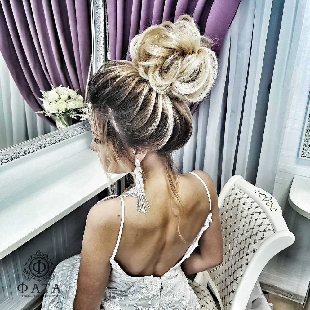 Для вечернего образа наиболее подходящим вариантом станет воздушный и легкий пучок. Для этого необходимо выполнить пучок на затылке при помощи бублика или валика. Но изначально не забудьте оставить несколько свободных прядей возле лица, чтоб потом превратить их в элегантные кудри. В завершении пучок можно украсить при помощи красивой заколки или фиксирующего лака с блестками. Еще один отличный вариант – пучок, который выполняется на затылке. Такая прическа отлично подходит для вечерних мероприятий в ретро стиле. Данной укладке можно придать слегка взбудораженный внешний вид или выполнить идеально – гладкой.