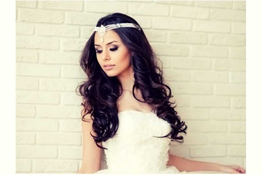 - Короны в восточном стиле надевают на лоб, как тесьму. Или есть варианты, когда они выглядят, как броши, свисающие с головы на лоб. Здесь будет уместна фата-накидка.