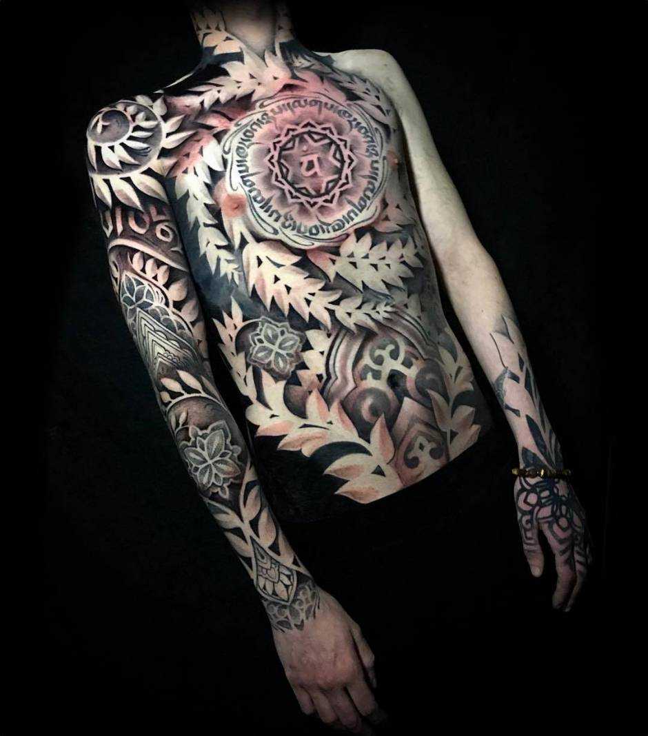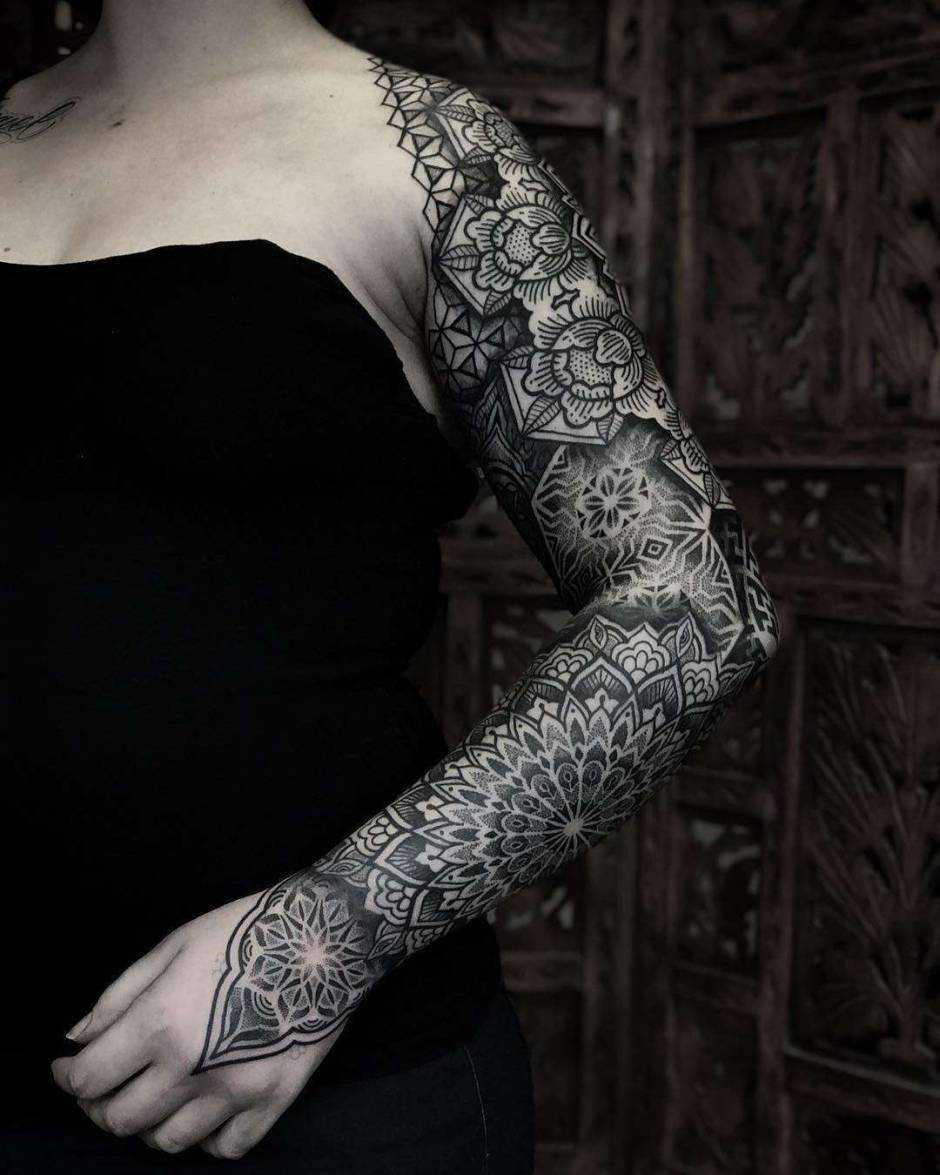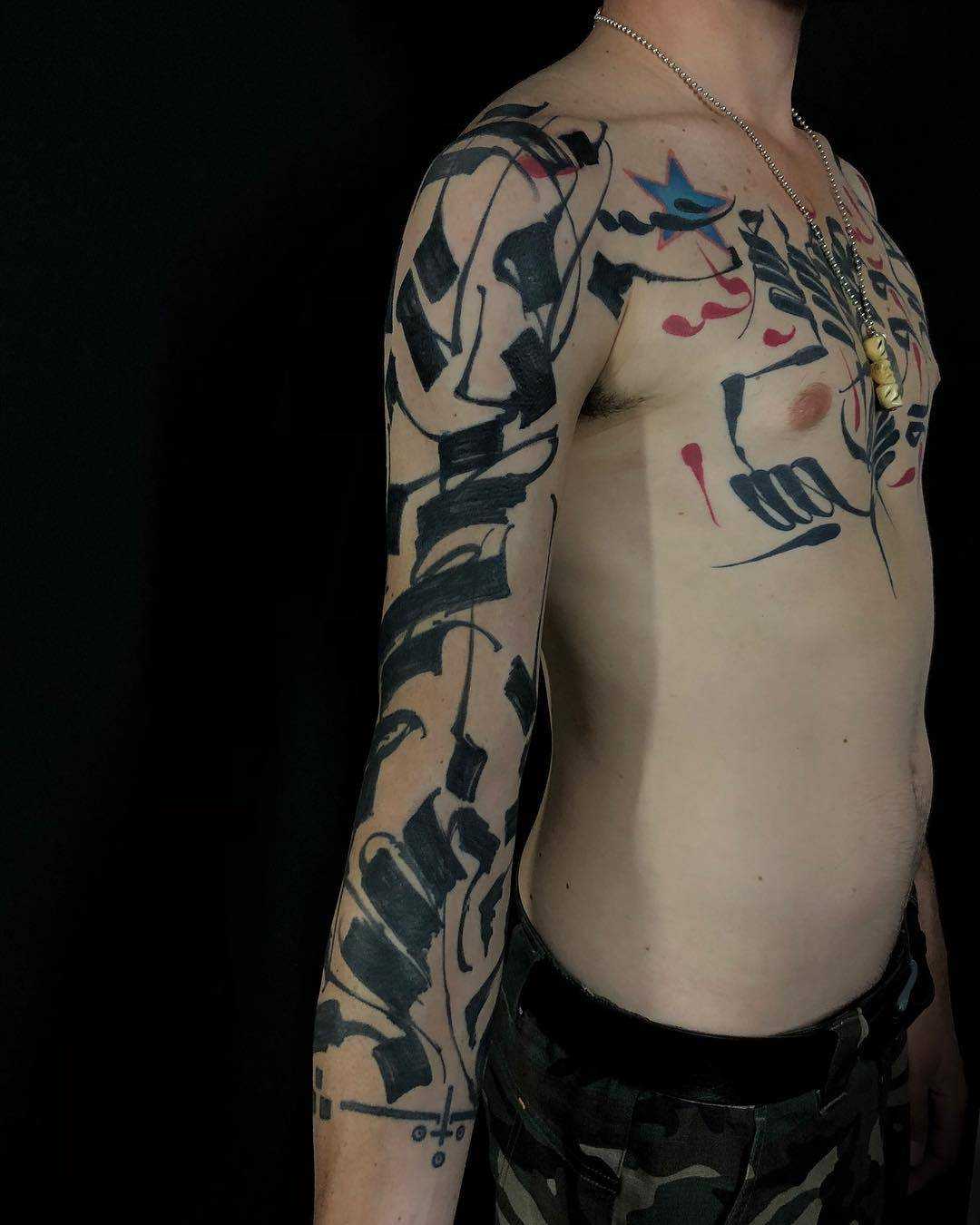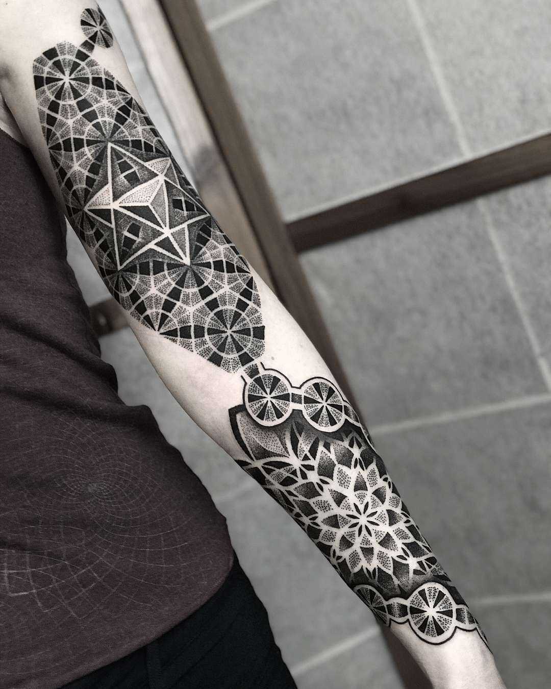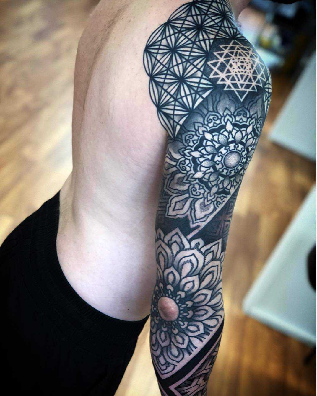 - Нанося на рукав, предпочтение отдается геометрии (круги, треугольники, квадраты, заполненные мелкими деталями), лицам, цветам, абстракции.