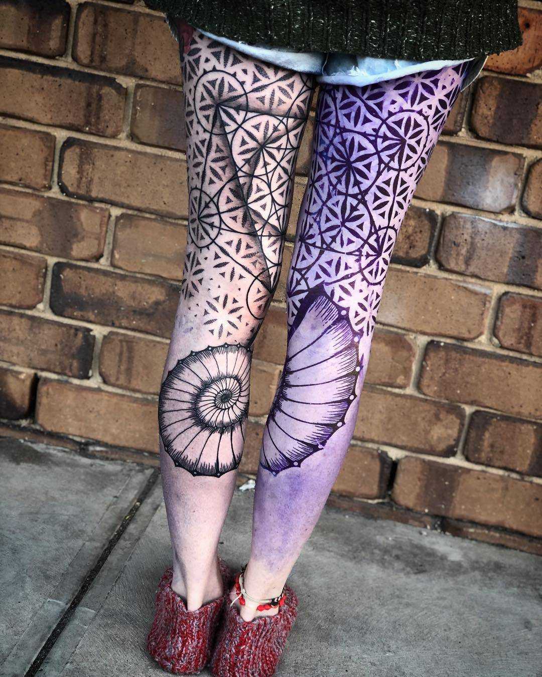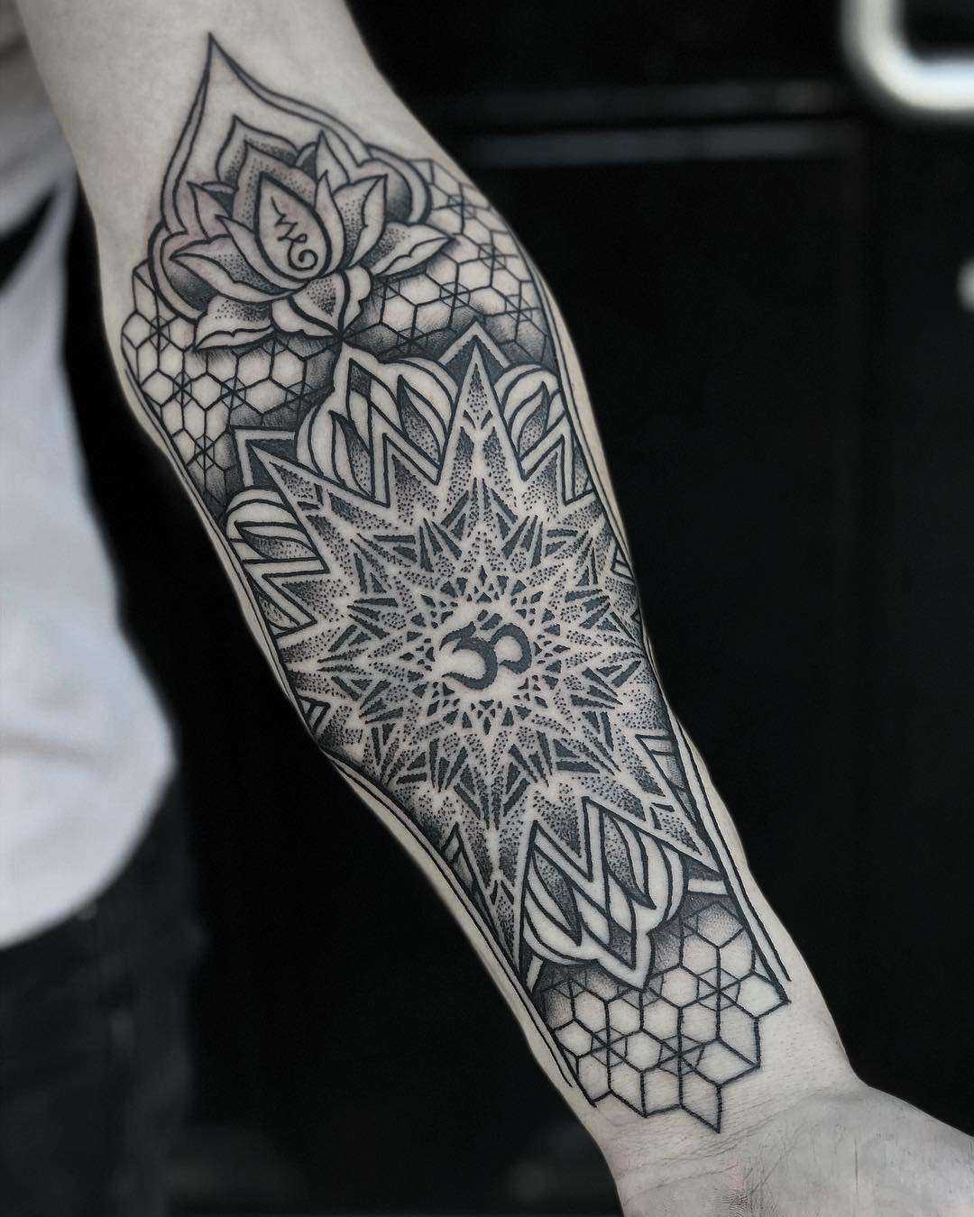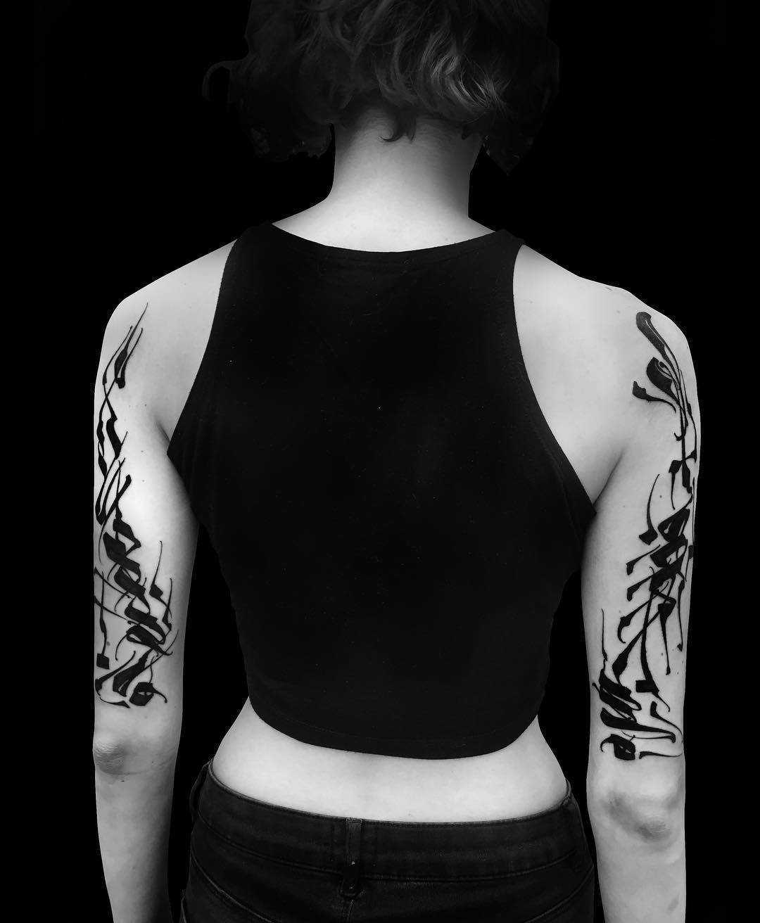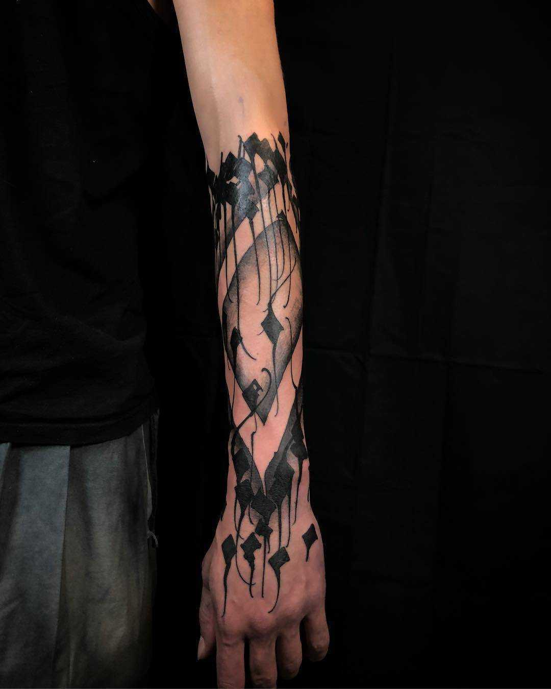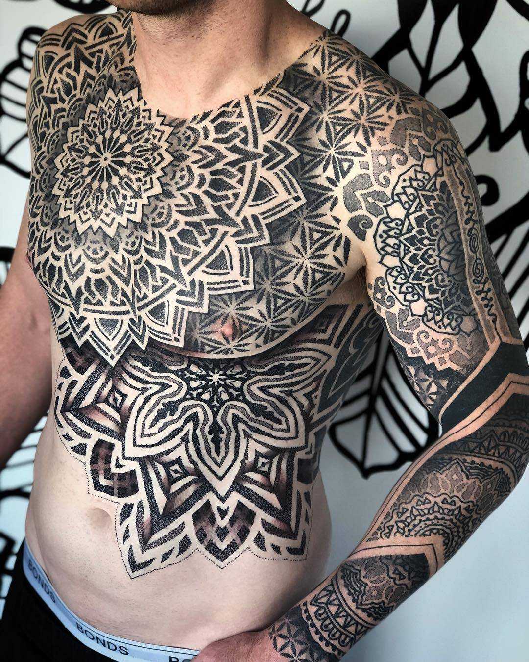 - Нанося на рукав, предпочтение отдается геометрии (круги, треугольники, квадраты, заполненные мелкими деталями), лицам, цветам, абстракции.