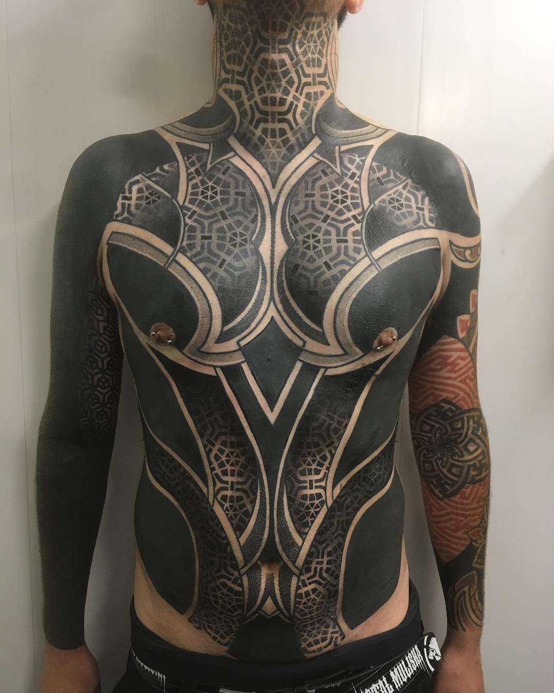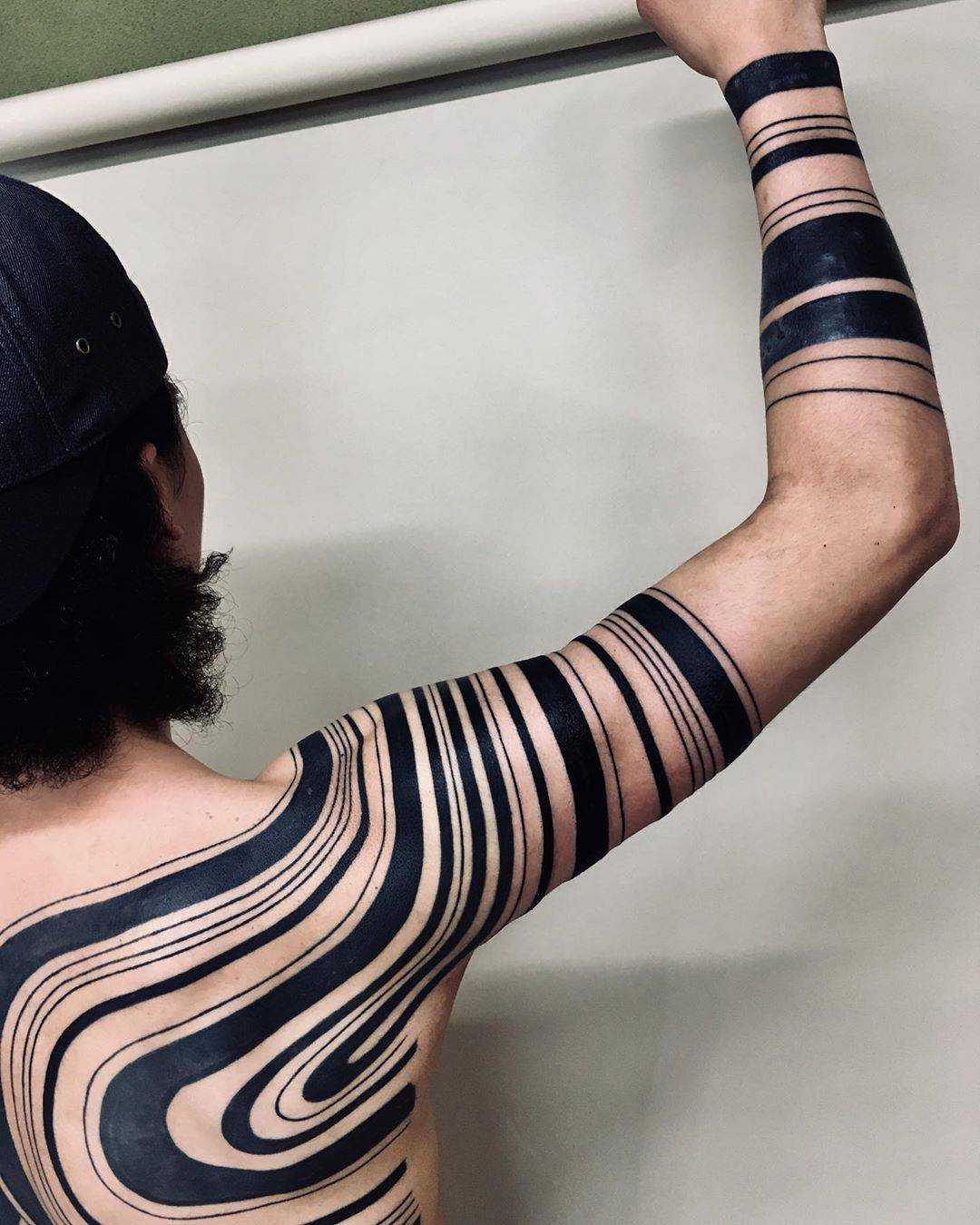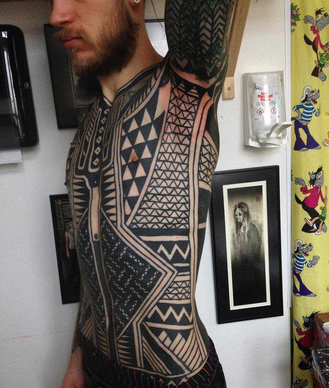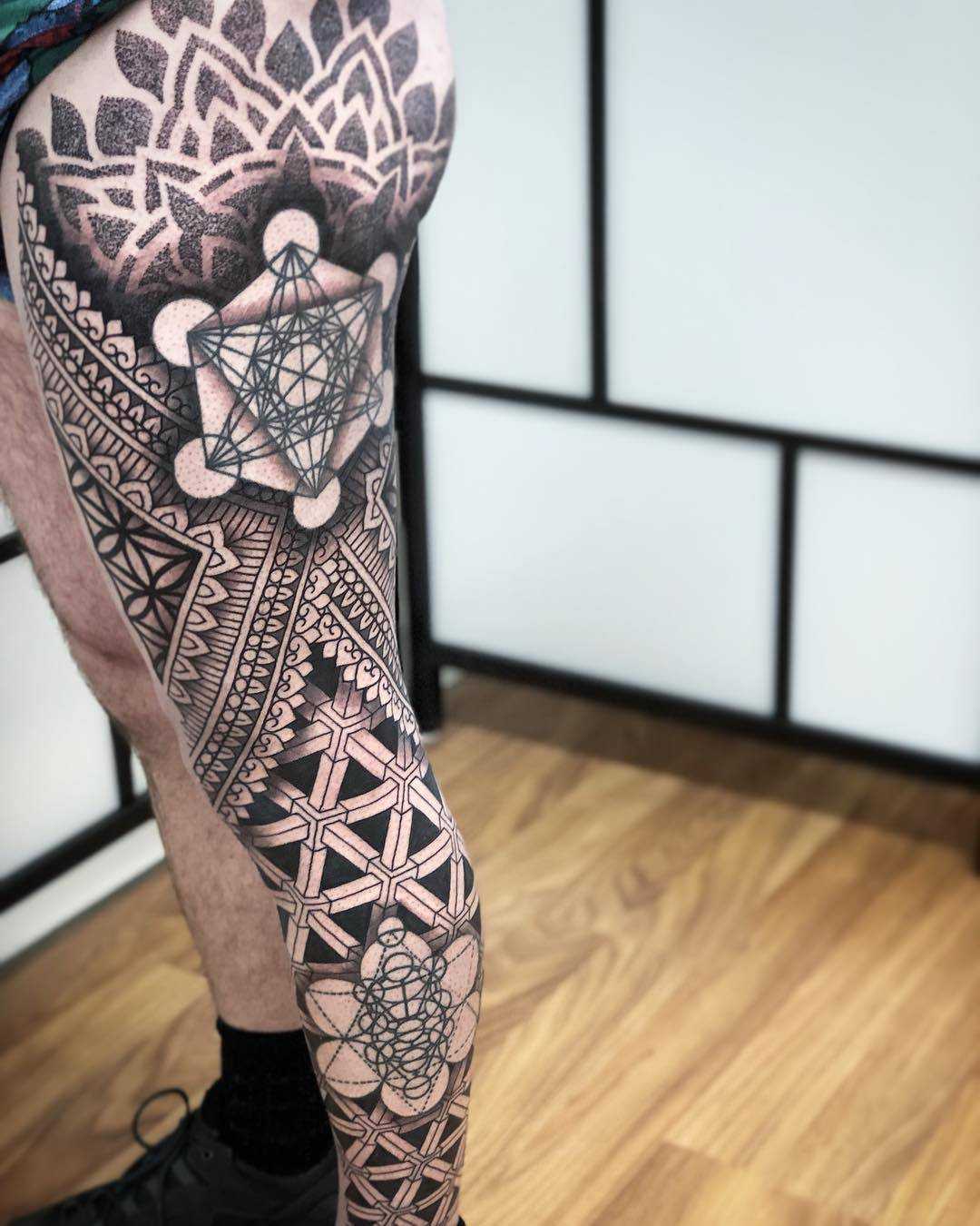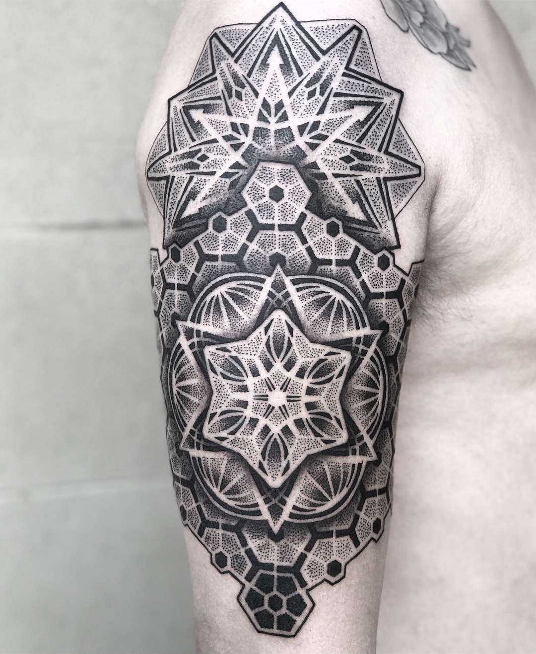 - Нанося на рукав, предпочтение отдается геометрии (круги, треугольники, квадраты, заполненные мелкими деталями), лицам, цветам, абстракции.