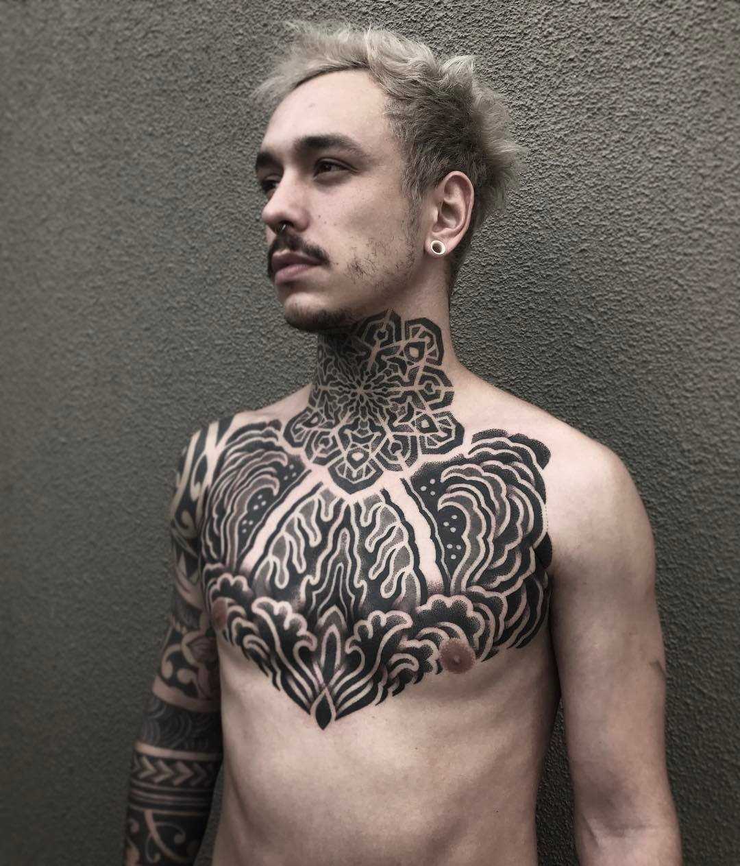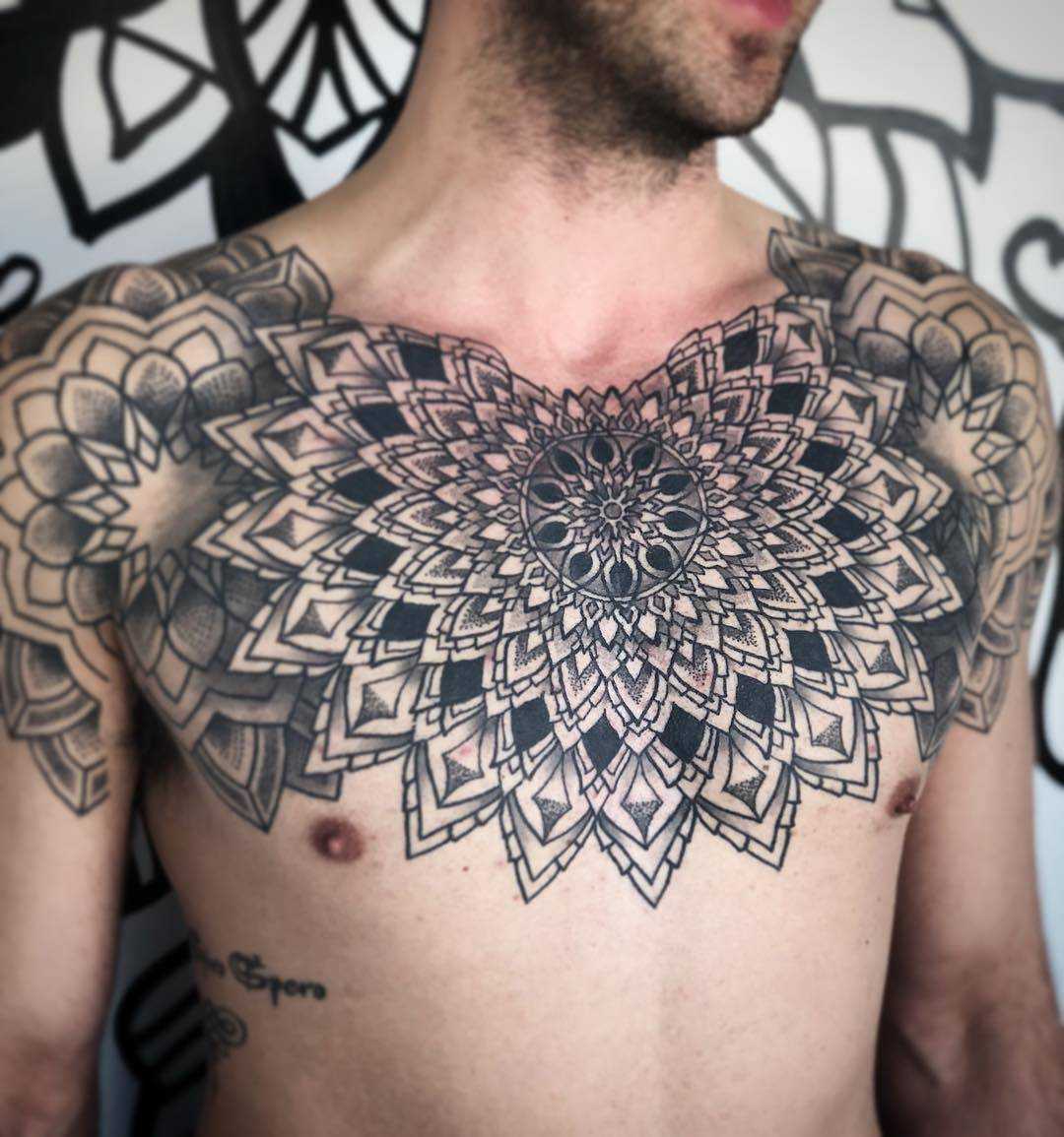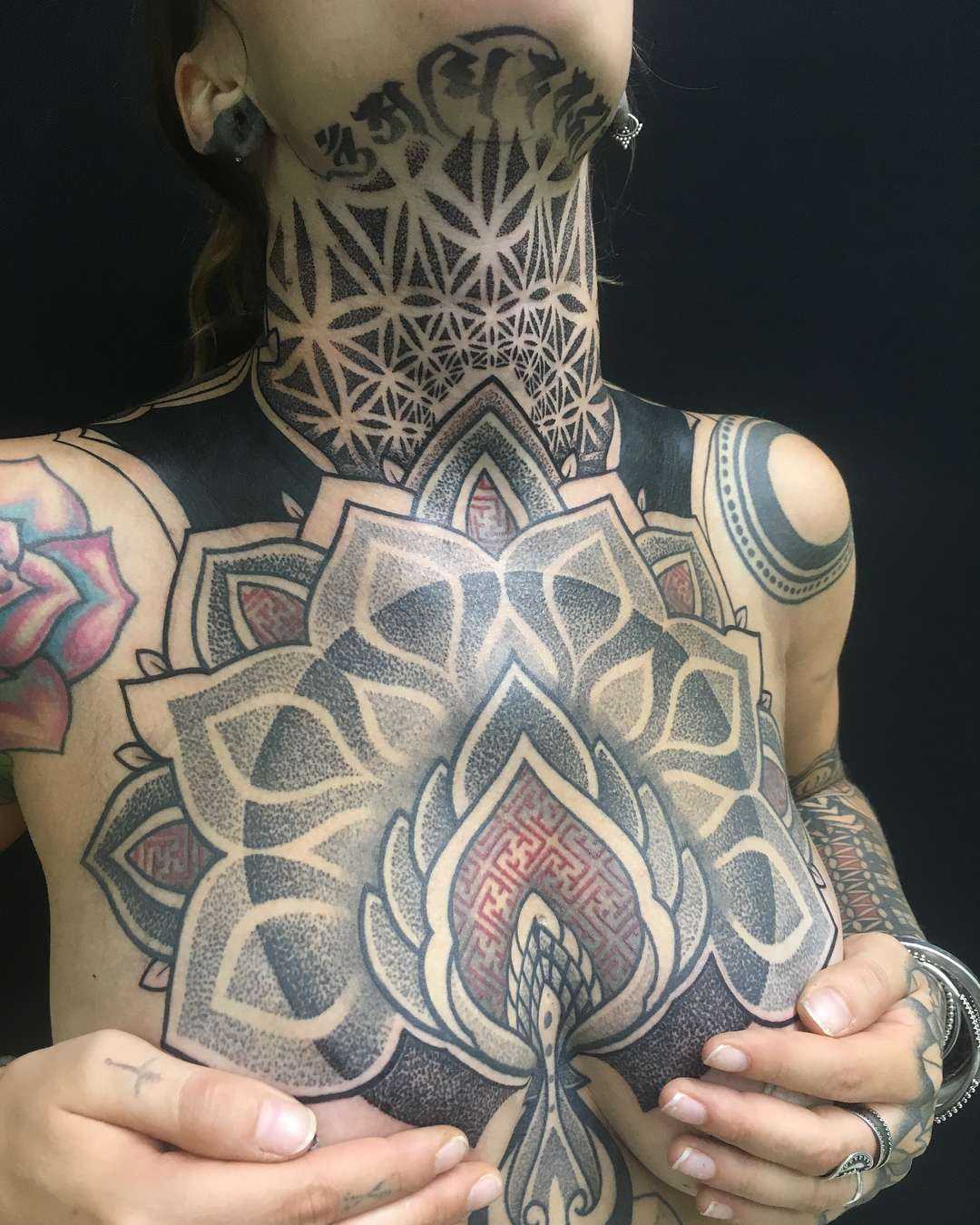 Отдельный тип женских тату на груди — рисунки на участке под грудью. В основном для этого расположения девушки выбирают орнаменты, мандалы или цветочные узоры. Такое тату смотрится очень кокетливо и сексуально.Особый вклад в моду на тату под грудью внесла любимица миллионов девушек певица Рианна.