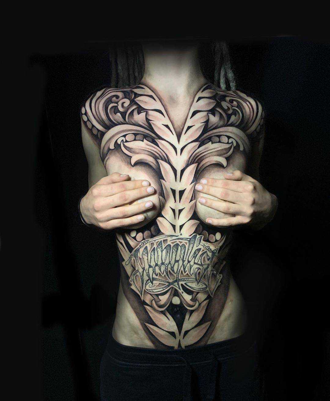 Девушки предпочитают набивать на ребрах под грудью небольшие рисунки. Это могут быть цветочные и ботанические мотивы, фразы или абстрактные изображения. Стоит отметить тот факт, что и среди девушек мало кого останавливают болевые ощущения. Ради красивого рисунка на теле все готовы немного потерпеть неприятное покалывание.