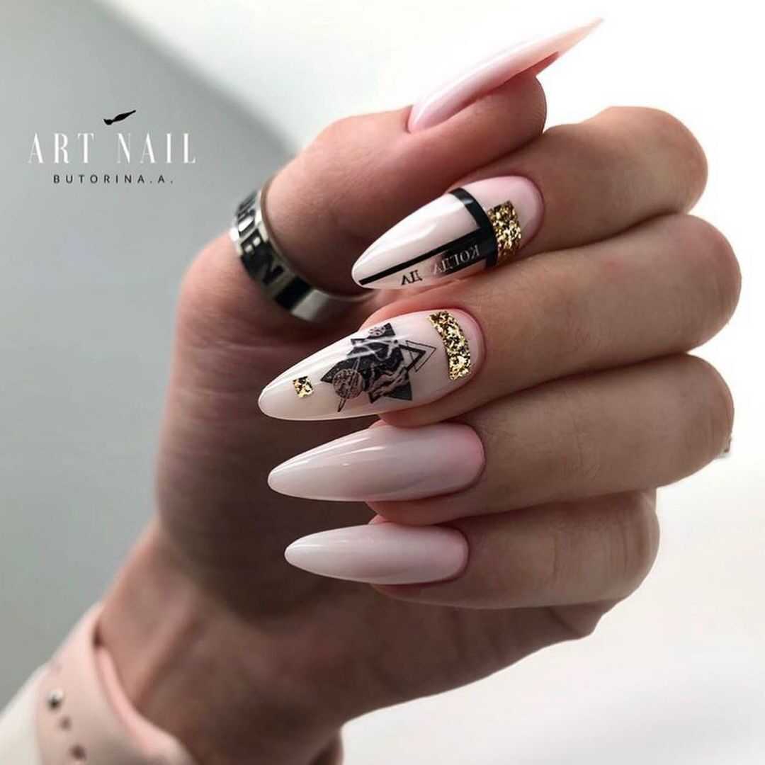 На острых ногтях чаще всего используются нежные и мягкие оттенки. Они облагораживают ноготки, делают маникюр сдержаннее. В качестве основных оттенков гель-лака можно использовать нежно-розовый, сиреневый, бежевый, кремовый. Эффектно смотрится молочный маникюр на острых ногтях. Молочный цвет представляет собой разбавленный белый оттенок. Степень прозрачности молочного цвета варьируется количеством прозрачного топа.