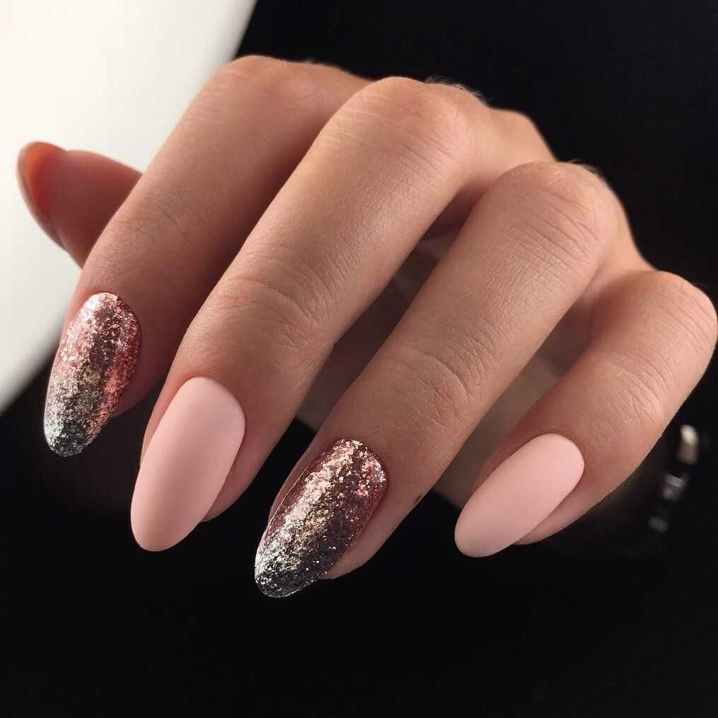 Такая эффектная и яркая деталь как глиттер вдохнет в розовый маникюр нотки торжественности и изыска. Даже матовый розовый цвет в соседстве с глиттером будет смотреться гораздо лаконичнее и эффектнее. Для декора выбирайте гель-лаки с глиттером, сухие блестки, пайетки и другой блестящий материал.