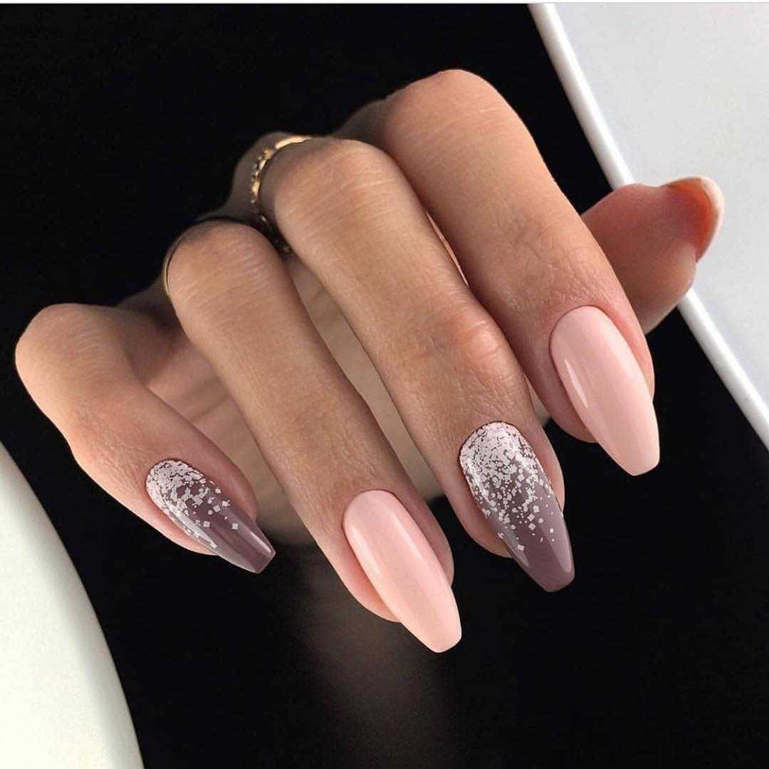 Розовый цвет в сочетании с серебряным глиттером смотрится сдержанно и очень женственно. Дизайн отлично впишется в повседневные и деловые образы. Даже наличие блестящего декора не сделает этот маникюр слишком заметным и вызывающим.