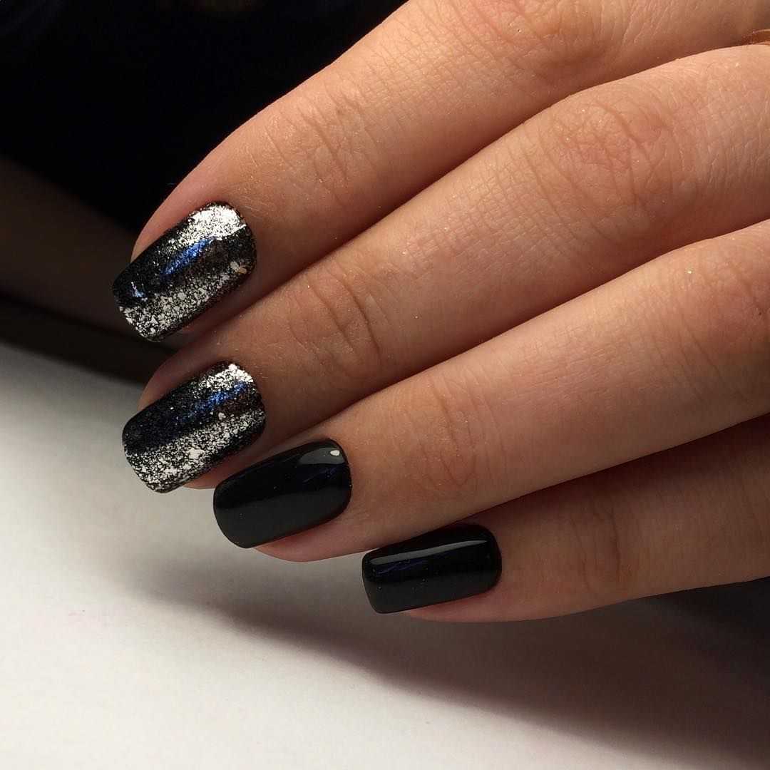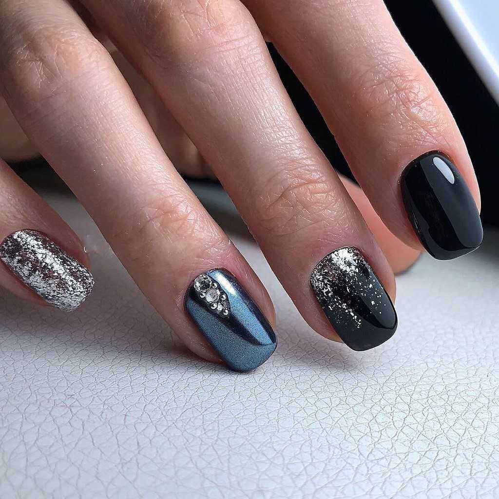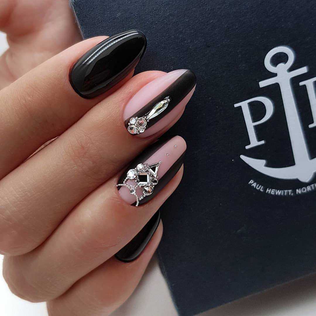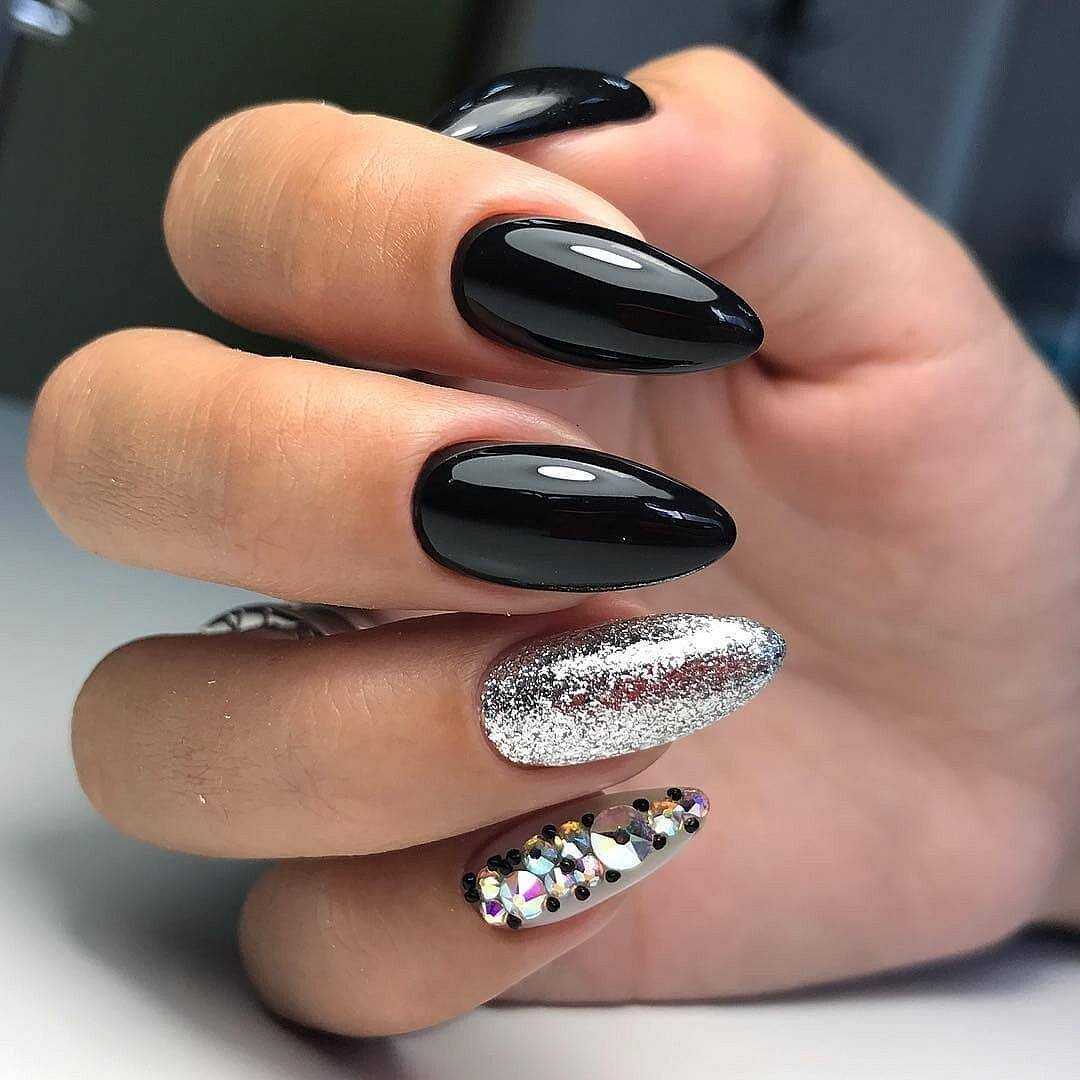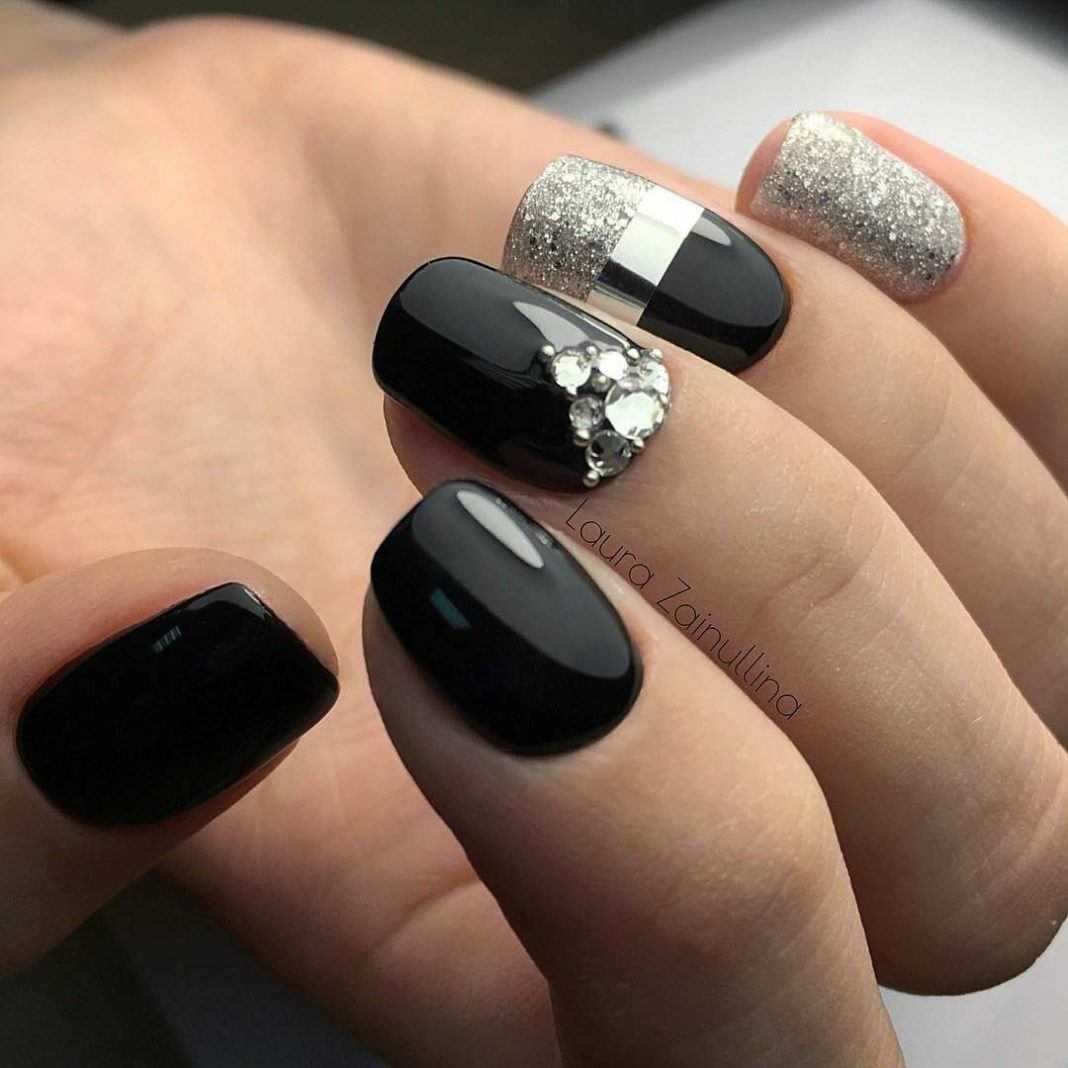 Не смотря на то, что чёрный маникюр с серебром достаточно выразительно смотрится сам по себе, его всегда можно несколько освежить и усовершенствовать при помощи страз. При этом объёмные украшения шикарно смотрятся в любой вариации дизайна. В этом модном сезоне это может быть потрясающая цветочная композиция с несколькими камнями на безымянном ноготке в компании с френчем и хаотичные серебристые полоски на чёрном фоне с россыпью камней. Однотонный дизайн в чёрном цвете с серебряным фоном, стразами и рисунком, выполненным тёмным гелем-паутинкой на паре ноготков. А также необычные композиции из украшений в области лунулы, матовый нейл-арт в чёрном цвете с объёмными украшениями и лаконичный минимализм с парой серебристых полосок и одиночными кристаллами на каждой ногтевой пластине. И, не забывайте, известное выражение – блеска много не бывает, не совсем актуально в этом случае.